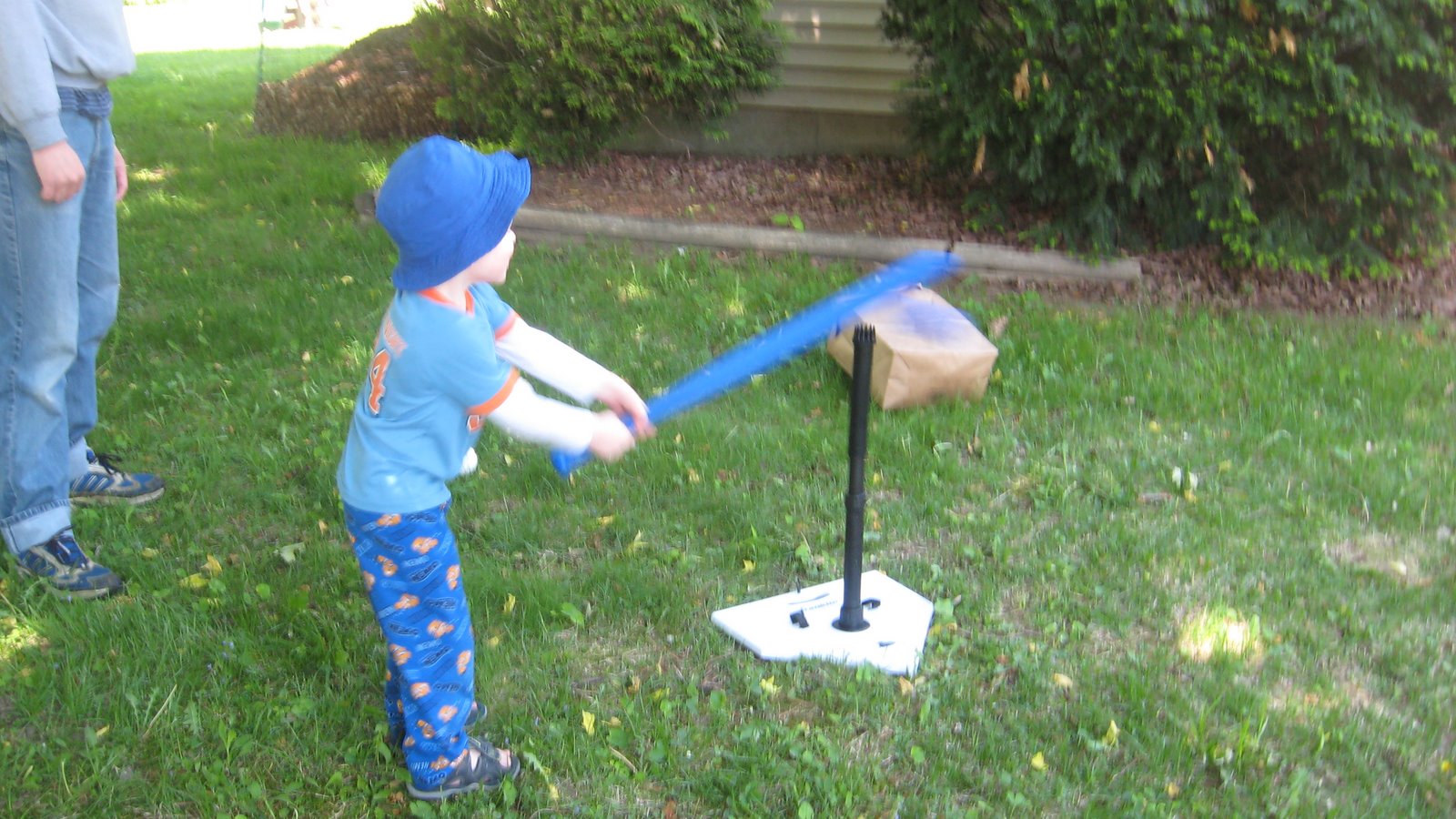 balls, a bat, a T-ball stand, books, games, trains and tracks,