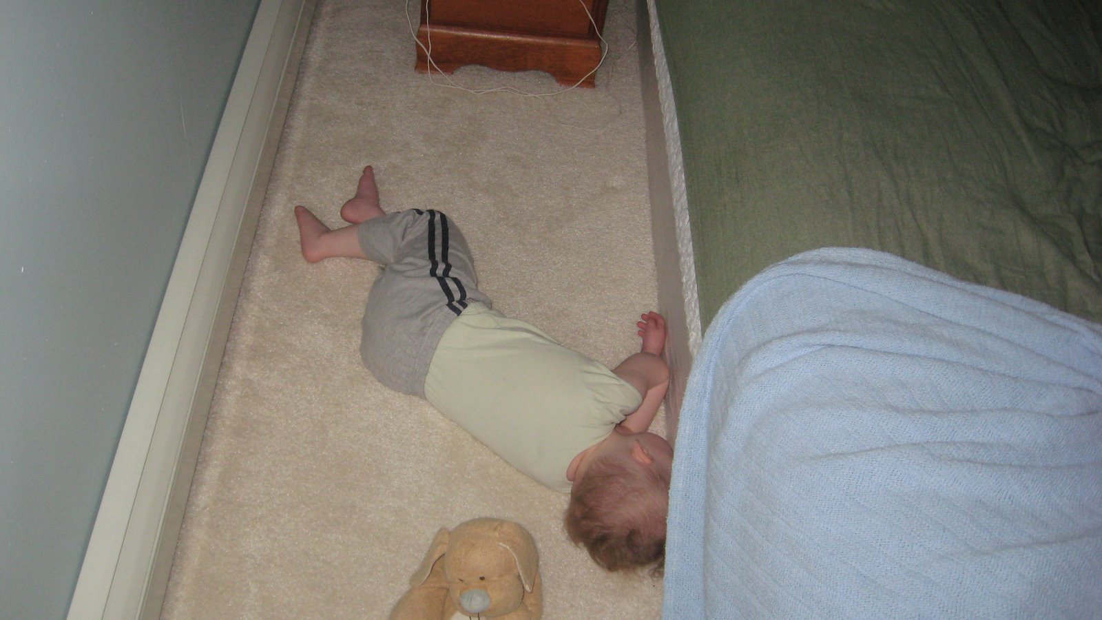 to get him to lay still in his bed, with me beside him, until