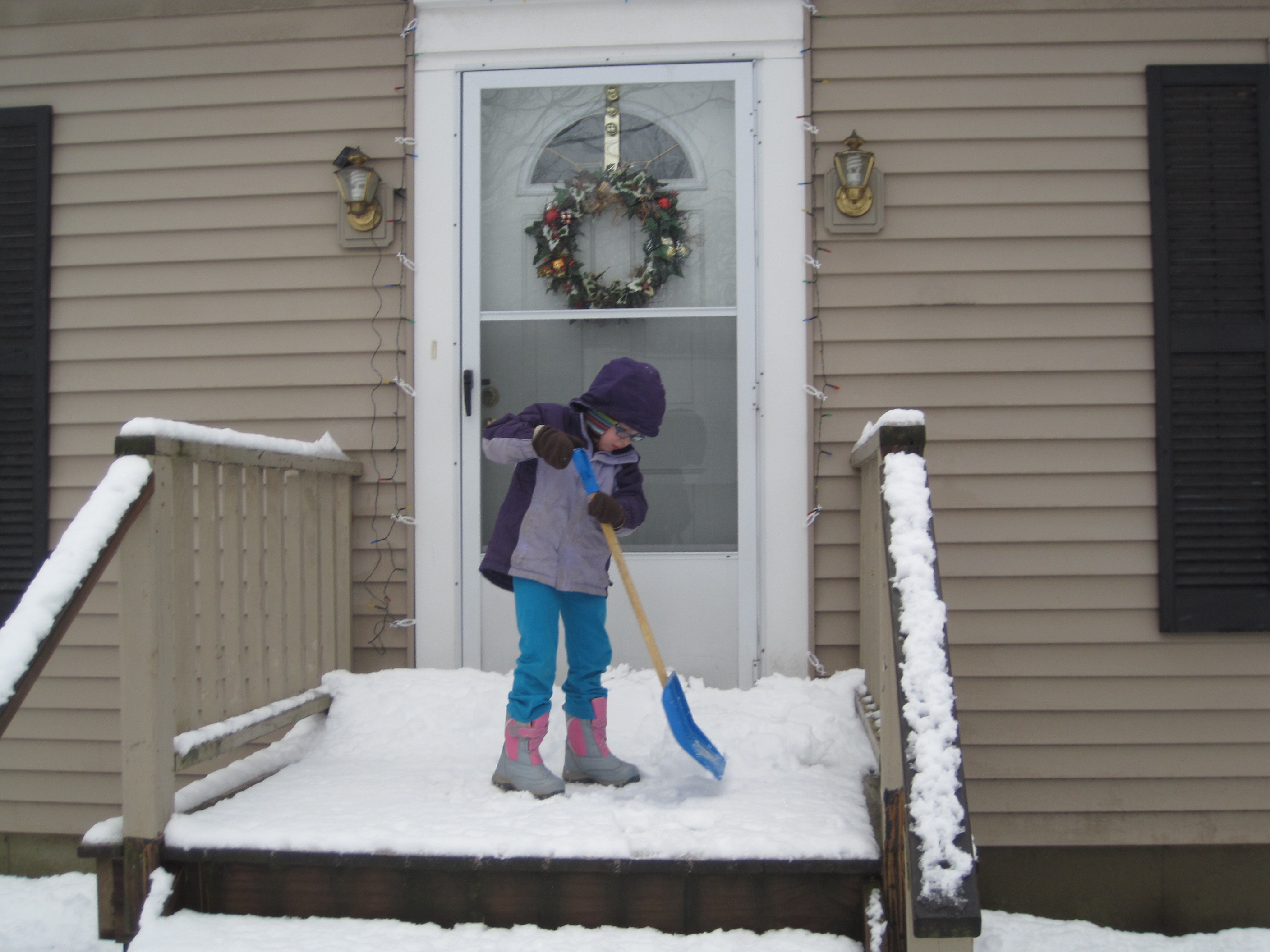Today, SNOW! Not a ton, but enough for now. :) Enough to get out the boots and shovels, enough to build a (small) snowman, enough to look like a white Christmas. Hopefully enough to survive the high 30’s and mixed sunshine day!