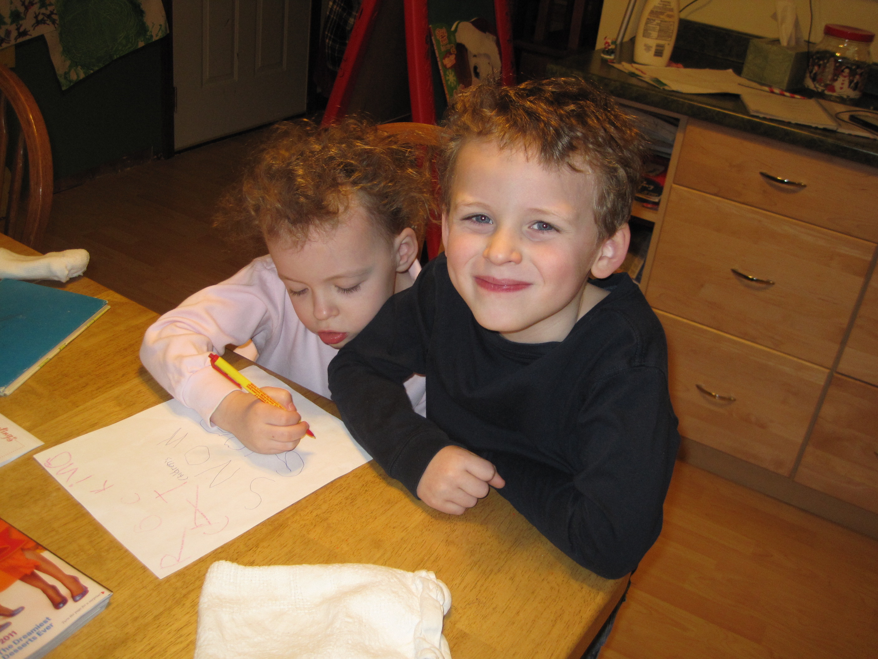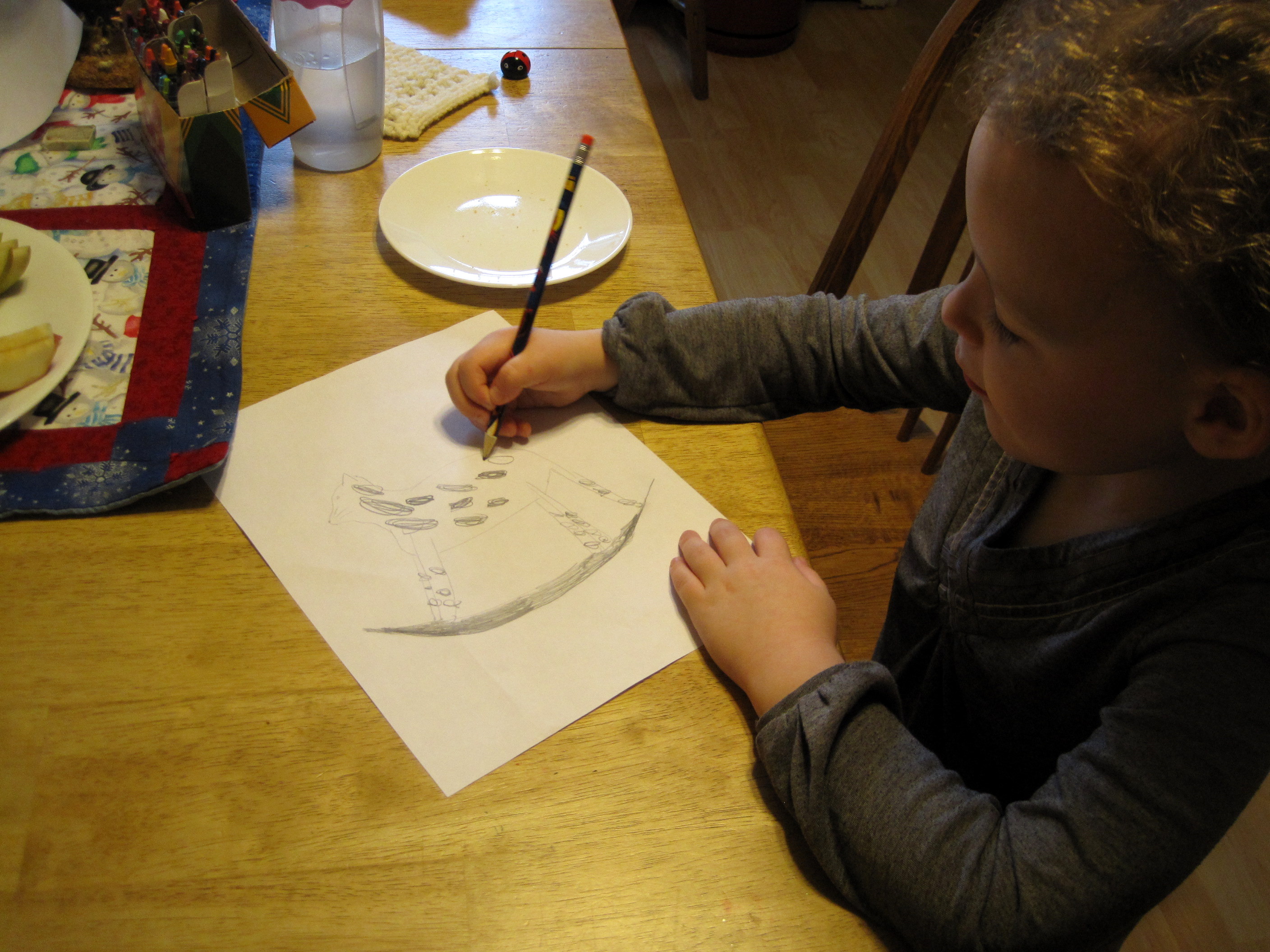 Eve's drawing (well, her coloring in my very rough drawing) and her name written in very small letters. She has been practicing that.