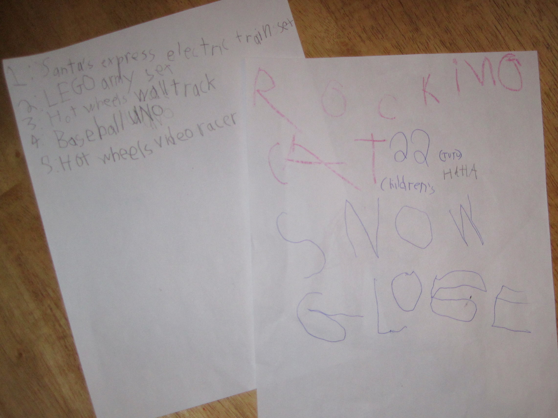 Enjoy! Let me know if you need help deciphering. On Lex’s list the first two items he saw in stores and the rest came from an SI Kids magazine special feature on Gift Giving. I wonder who they think their child readers are going to be GIVING these gifts to… hmmmm….