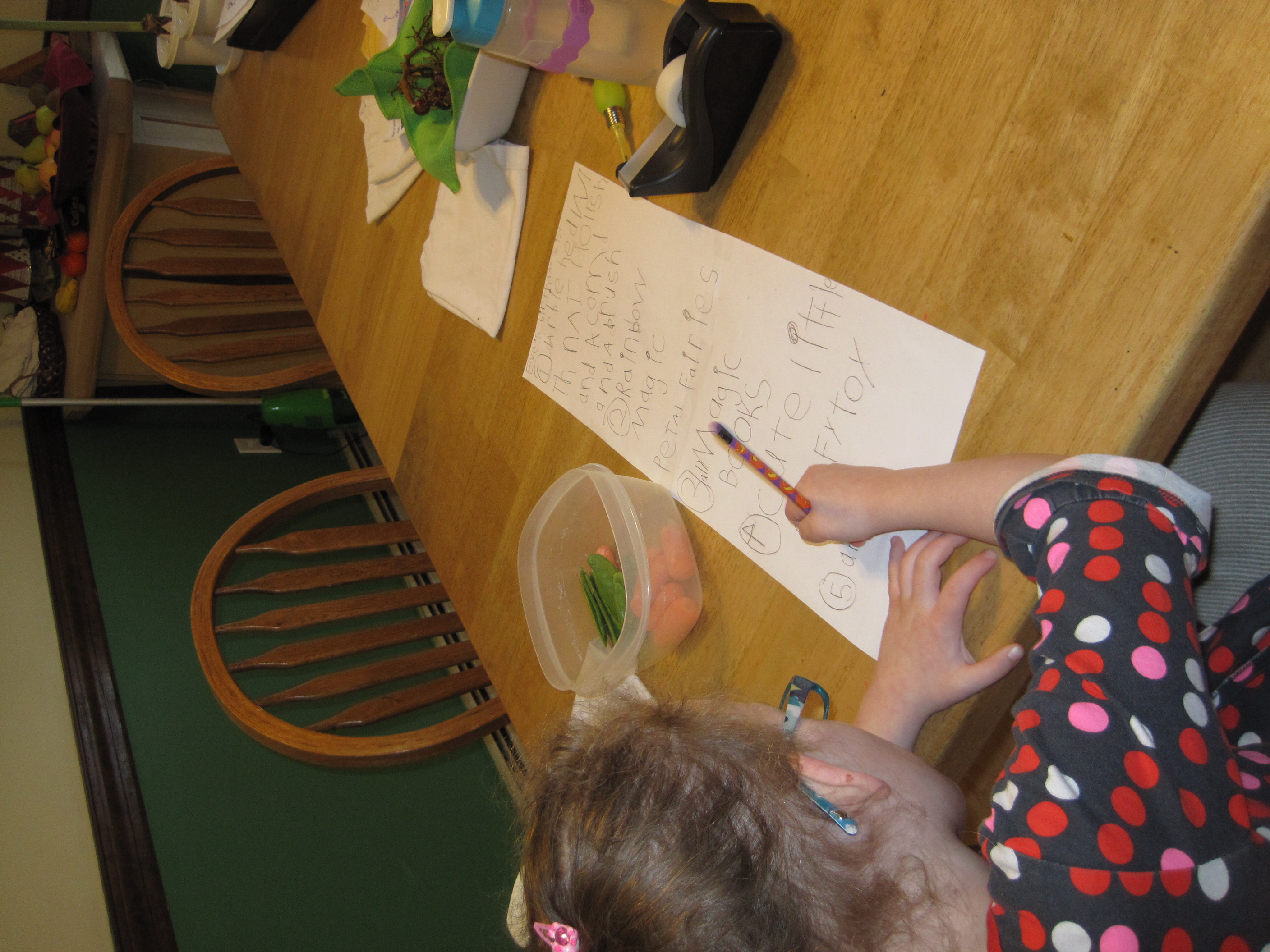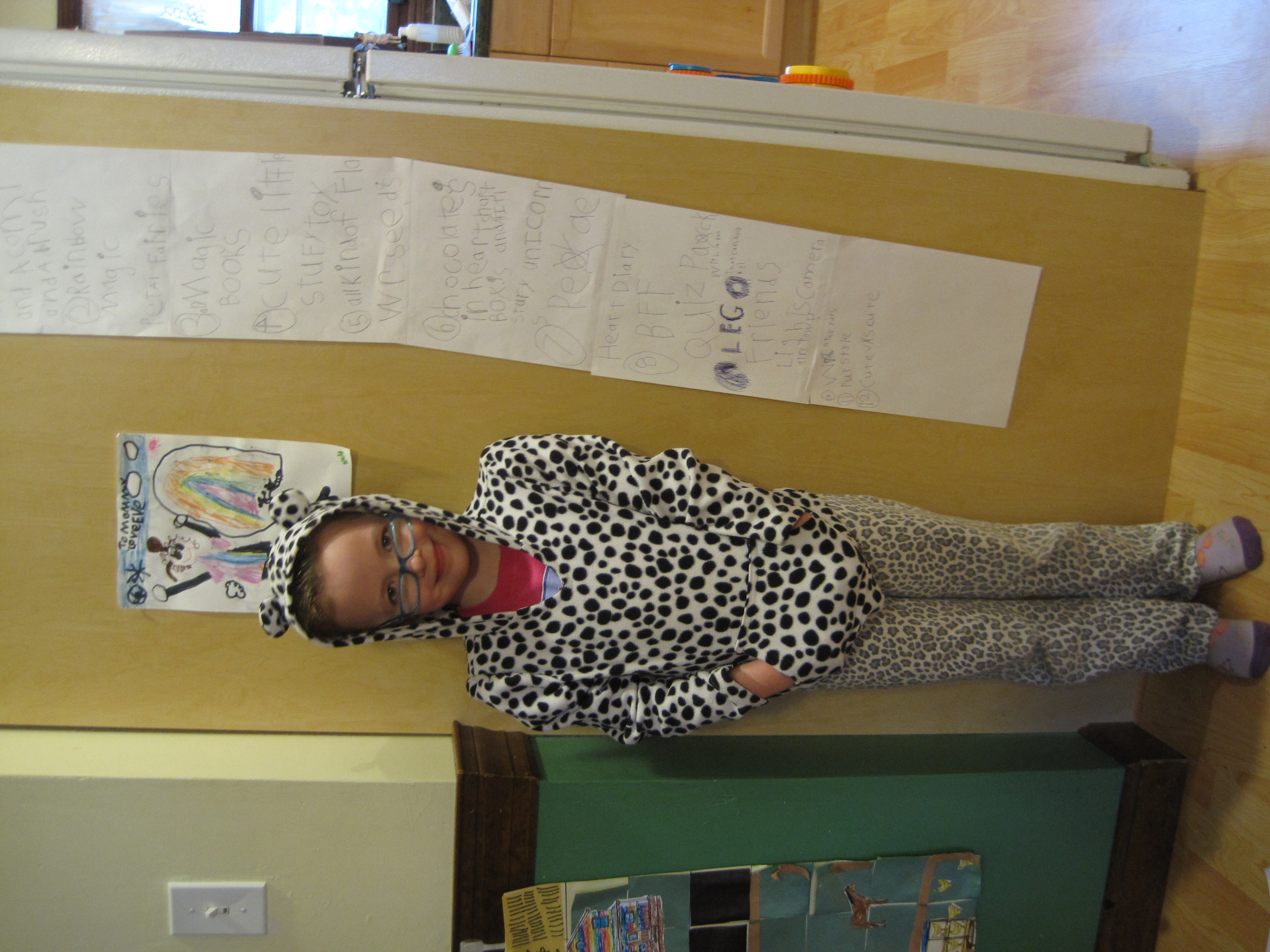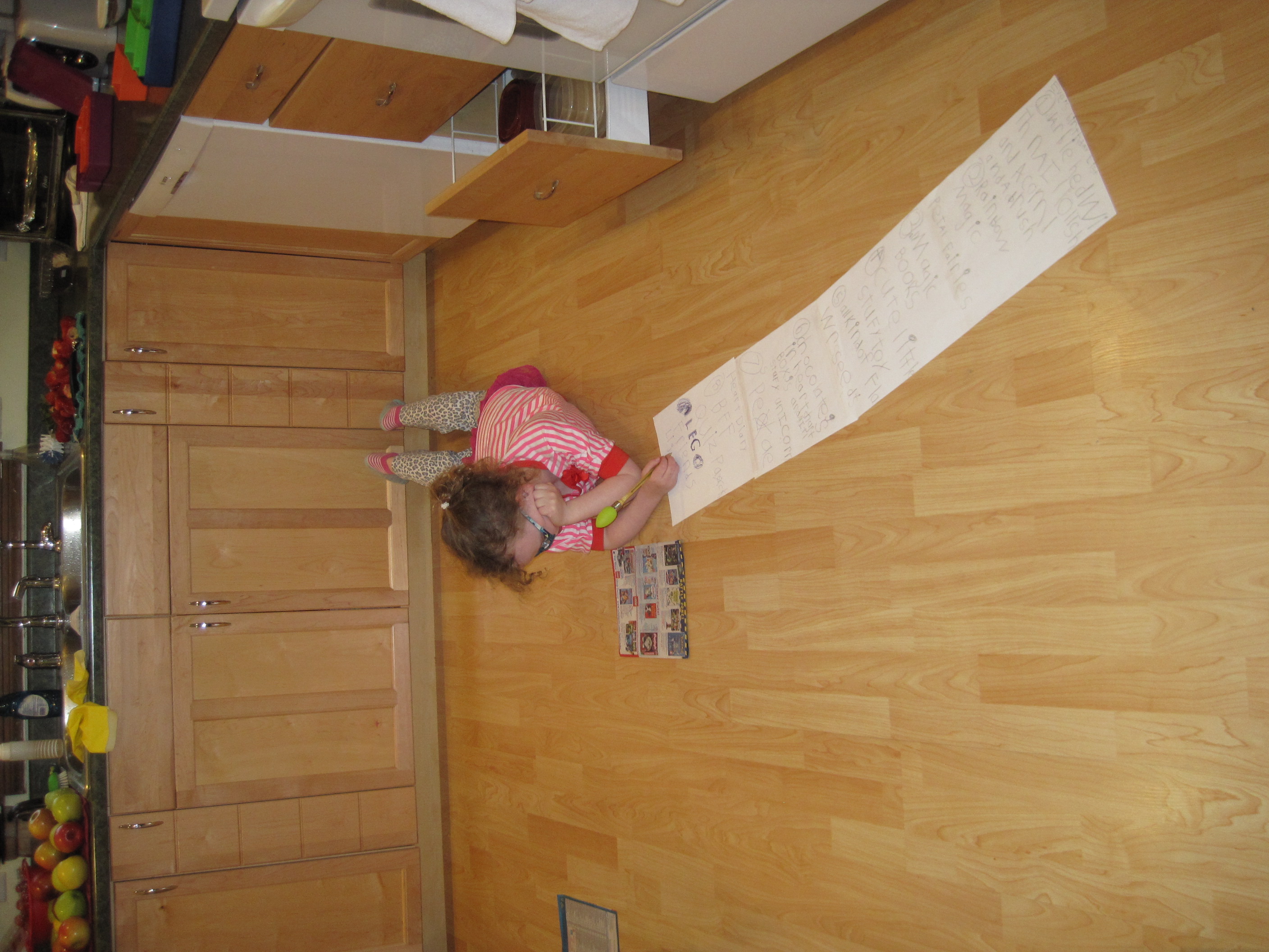 It outgrew the fridge so we hung it on the wall. Notice how there’s room for another page, just in case. :) She’s a little “wanty” this year!