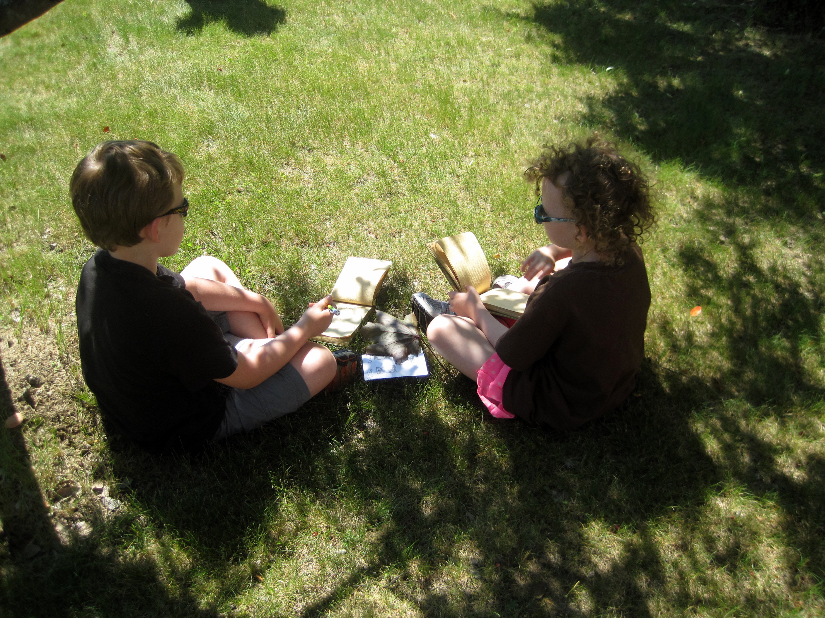 We went on a tree walk today, organized by the town’s Tree Society or something. I was surprised that the kids were interested. I think Alan sold them on the idea when I wasn’t around. I suggested they bring notebooks and write down interesting things they learn. They took me up on the idea and Lex took it quite seriously, drawing and detailing each tree we heard about.