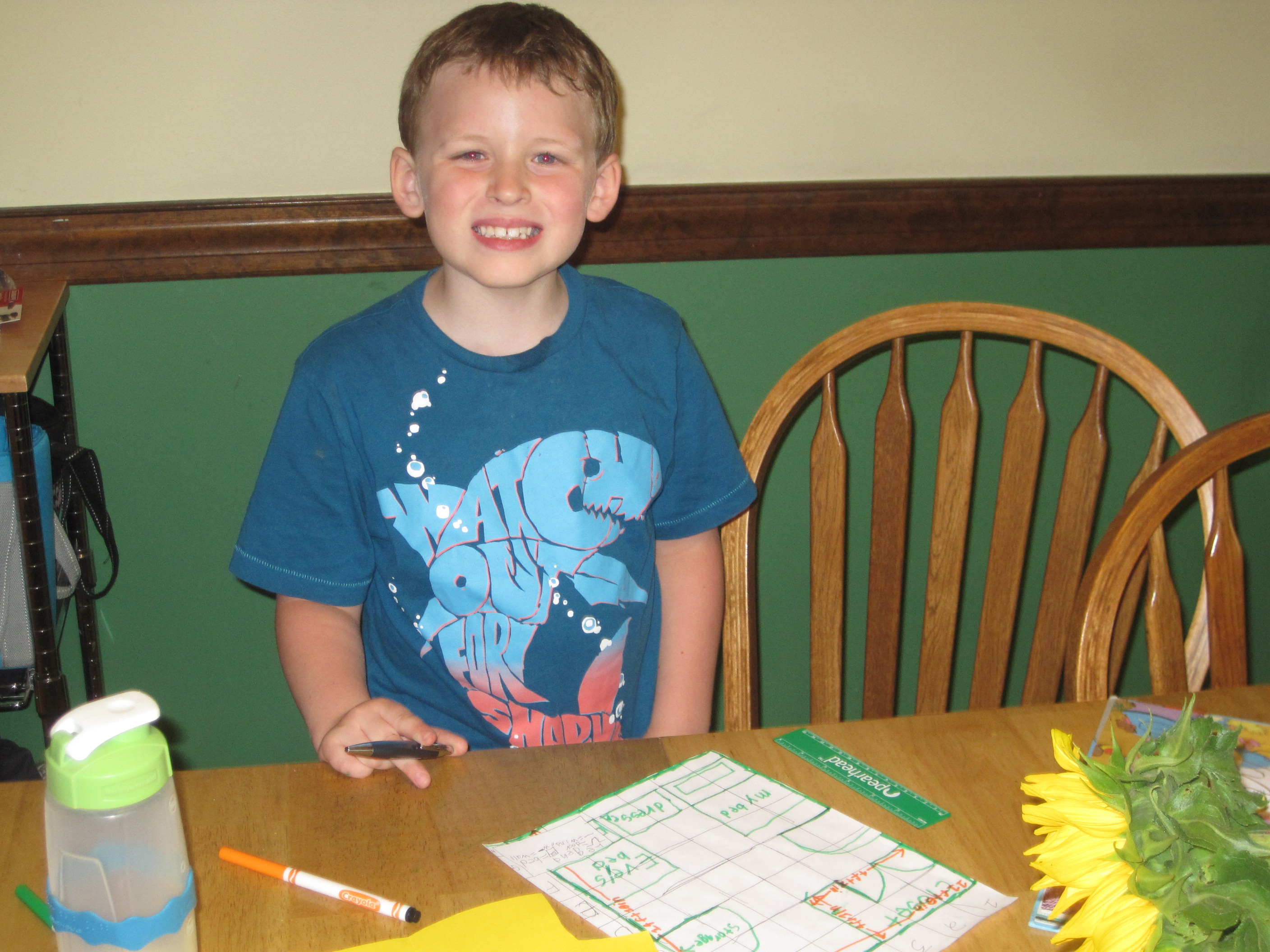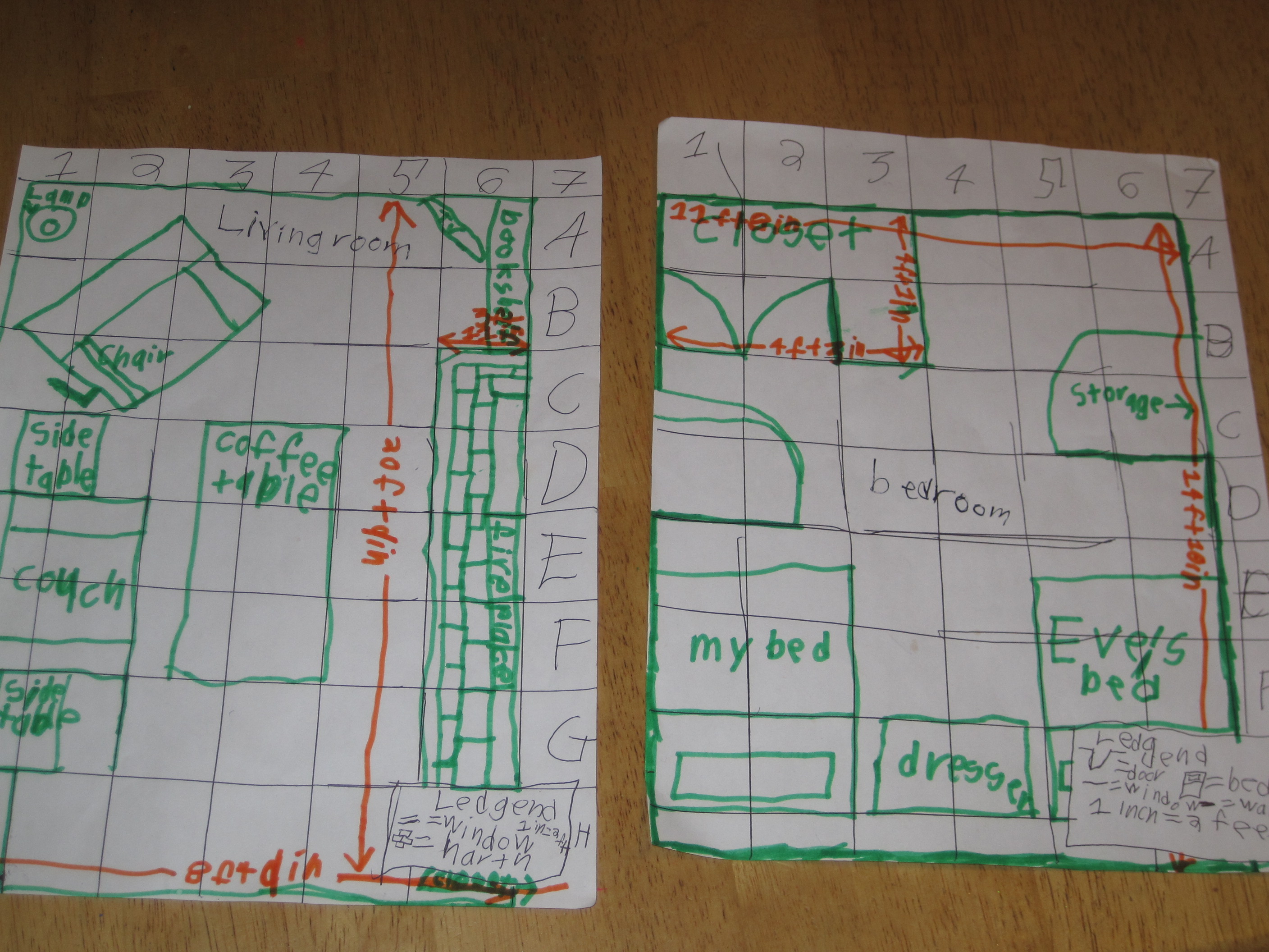 Then he decided to make a map of his bedroom. This time he used a grid and a scale. And spacing between his letters. A more sophisticated map! He did his bedroom and the living room. Acknowledging, but completely disregarding, my suggestions for refinement. He even used a tape measure to measure the rooms, though I think he mismeasured the living room furniture. :)