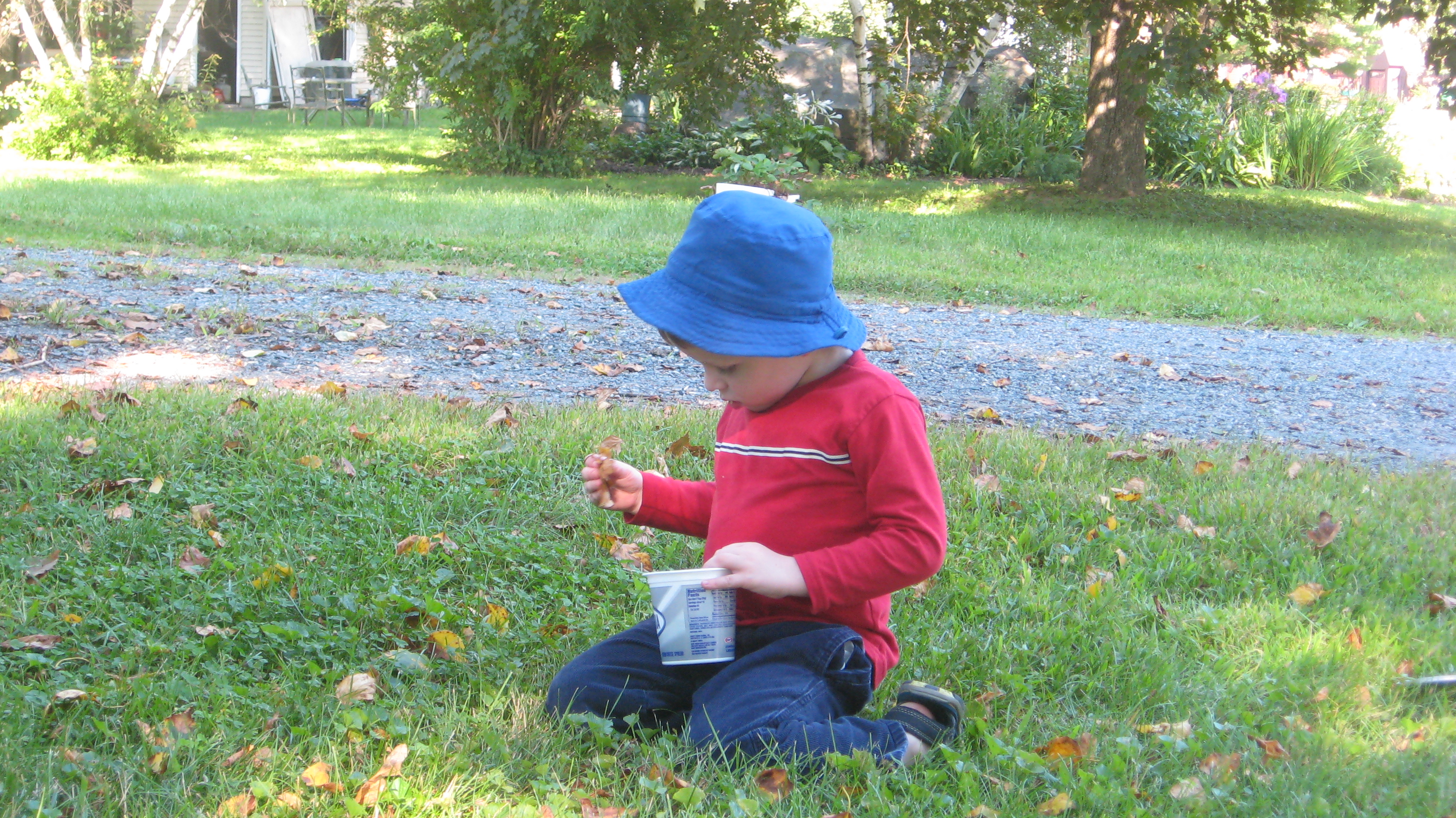Just as I was starting to think about raking, Lex announced his own leaf clean-up solution: pick them up and store them in an old cream cheese container! He got started today :)