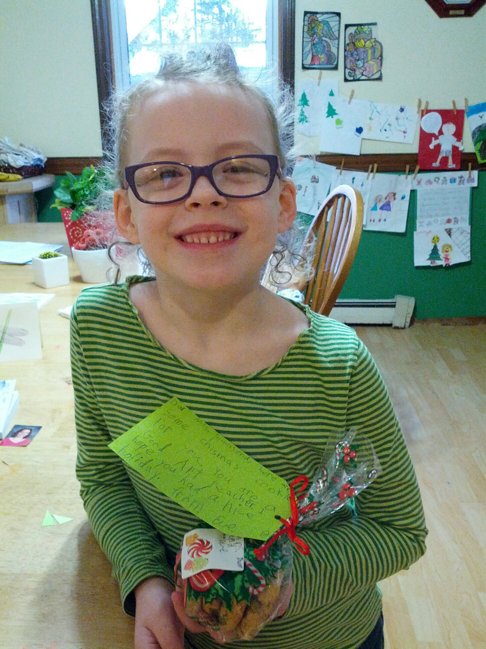 Eve remembered this morning that her art teacher wasn’t there the day before Christmas vacation and didn’t get the cookies Eve brought in. She was very concerned that day that her art teacher would have no holiday cookies. :-)  She has art today and insisted on bringing her teacher cookies.  Fortunately I still have a batch of peanut butter cookies in the freezer. I think her teacher will be surprised!