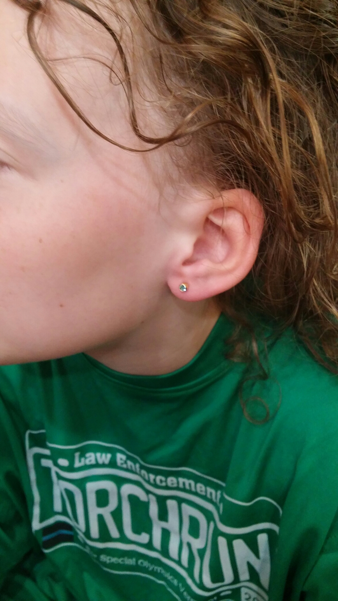 A few months ago Eve decided she wanted to get her ears pierced. She started saving her money, earned the final amount at our yard sale last weekend, and immediately wanted to get it done! We drove around all afternoon, but could not find a place that was open, did ear piercing, and had someone available to do it. Seemed like the magic trifecta did not exist on a Saturday afternoon! Eve was disappointed, but she rallied and we made an appointment for Tuesday morning instead. The big day FINALLY came and she was thrilled! She asked, a lot, about how it would go, how much it would hurt, what the earrings would look like, and would they get infected. I told her Rosy’s story and she said, “Yeah, I know. Rosy told me.” :)