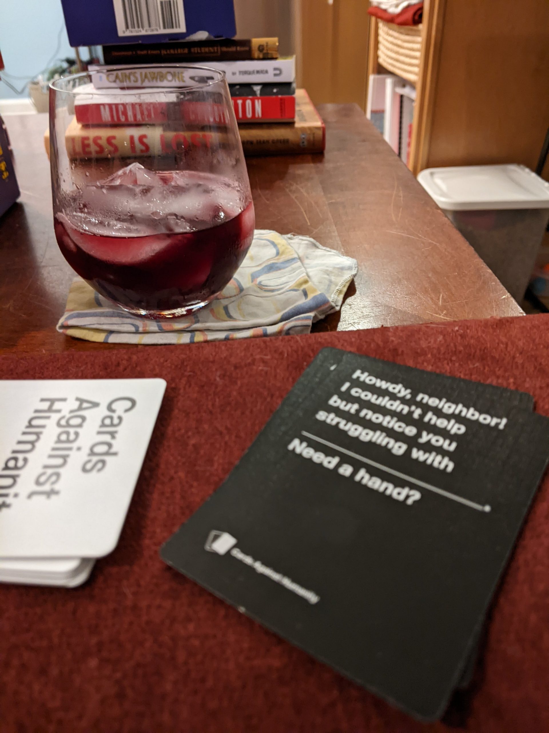 We celebrated New Year’s Eve in the usual way, sort of. Cheetos (puffs and crunchy) and card games. B’Lake and his girlfriend wanted to play Cards Against Humanity instead of Apples to Apples, our usual NYE go-to. Eve was in for it, but Lex was not comfortable with the game (or the change, or both). We played a few rounds of CAH, then switched to A2A, but people got cranky and annoying, and we probably started too early, so we broke to our own corners for awhile. The kids plugged in to their screens and I finished a puzzle – my second this vacation! We regrouped at 11:45pm to watch the ball drop.