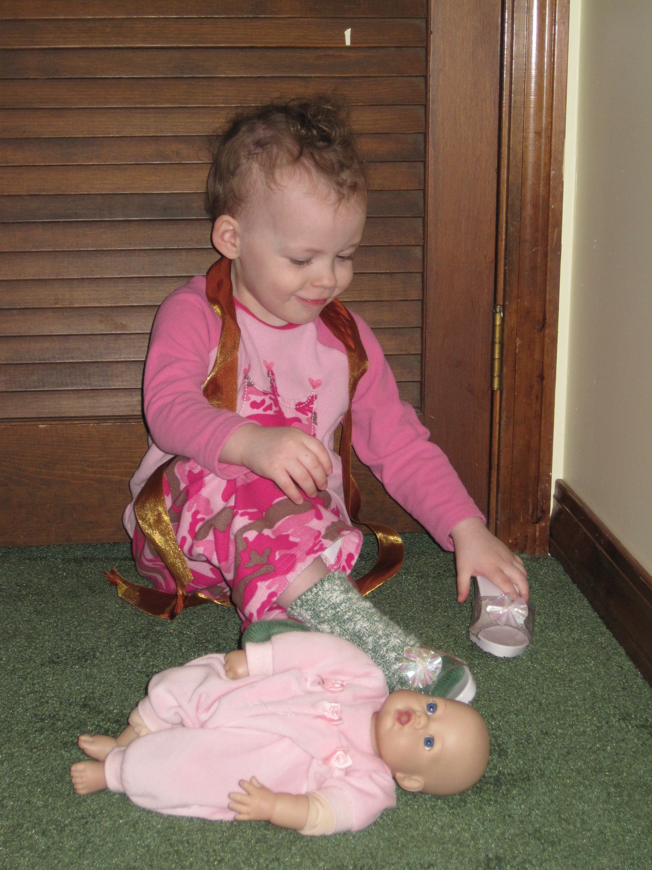 This morning we had a very gender-stereotyped morning. Alan and Lex exercised in the office and I folded laundry. Eve “sewed” a pocket, “knit” me a hat, made a birthday party for her baby, and “washed” and “dried” baby’s blanket after “baby threw up on it.” So much domestic creativity packed into a short period of time.