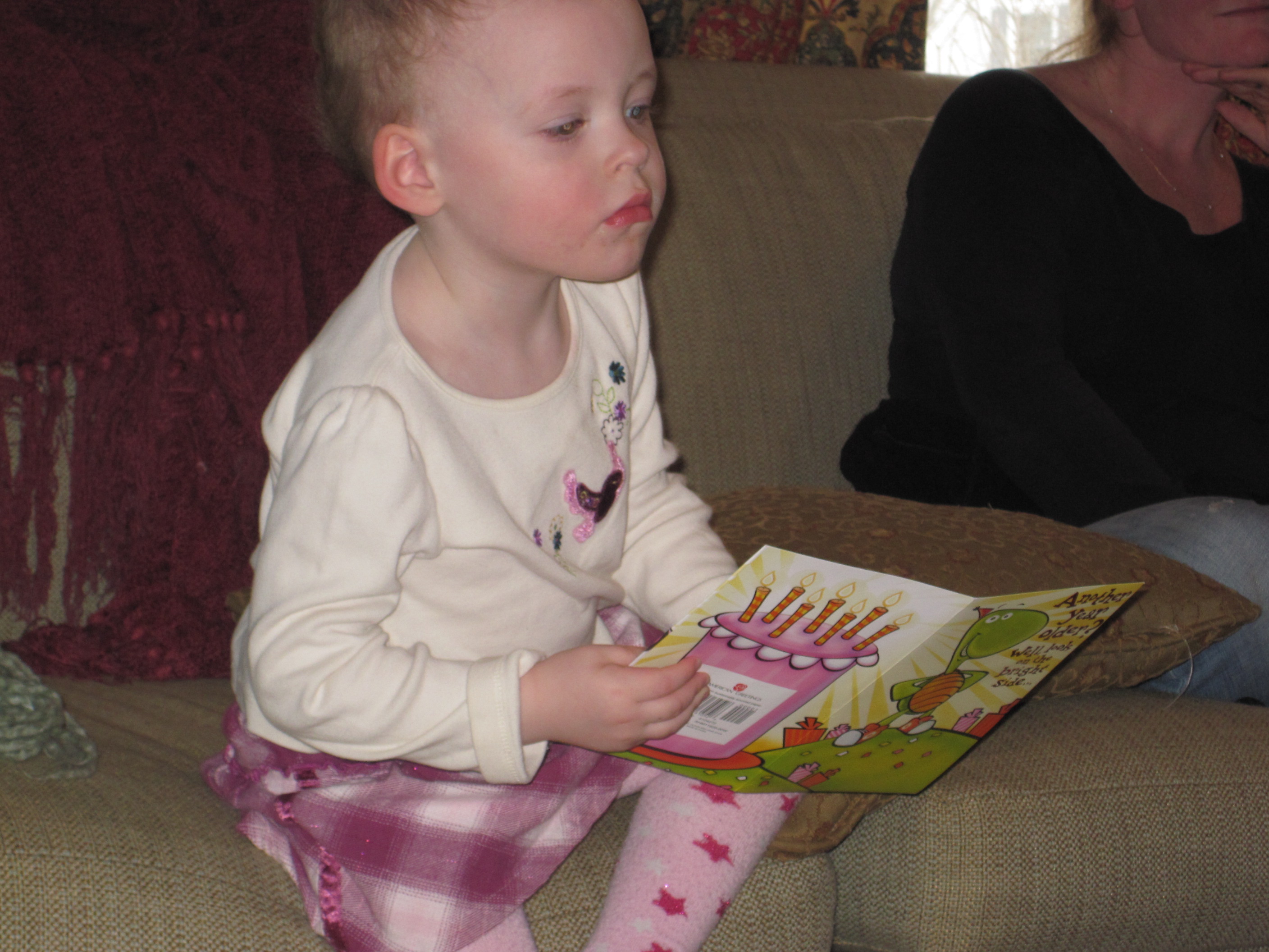 We had a fun, but mixed up day yesterday. Lex and I went to WW in the morning and then went for haircuts, but they couldn’t fit us in, so we came home. We played for a bit and then went next door for Parrish’s birthday party. His mom said only a few people had RSVPed, but almost his entire class was there. It was great! The kids were all so well behaved, the food was plentiful (it always is at their parties!) and it was nice to be able to socialize with the parents that chose to stay. When it was time for cake all the kids ran to the kitchen and Lex ran into the farthest away room possible. He still is not one for the Happy Birthday song. He came out for a piece of cake once the crowd cleared out. Then they opened presents. It was fun to watch the kids start off sitting comfortably on the couch and then slowly creep their way forward until, about half way through, they were all piled on top of each other and we had to “reset” them back on the couch, only to begin the excited creep forward again! :) The party was from 11am-2pm, right at naptime for this family. Eve got pretty angry when I suggested leaving her home for a nap, so she came and partied hard with the rest of them. She almost fell asleep in my arms at one point, but she rallied for cake.