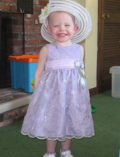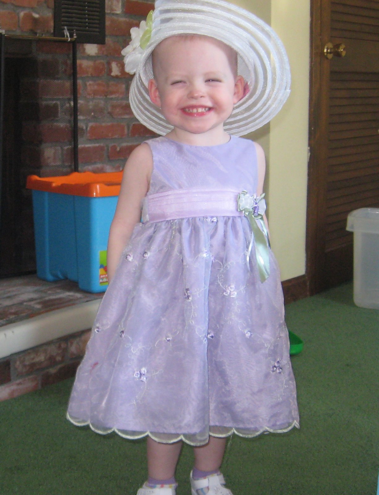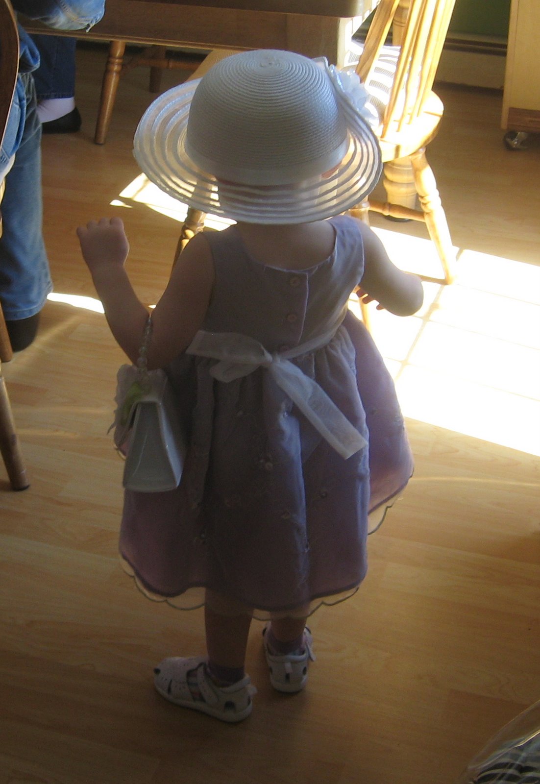 too-big shoes, a fancy hat and purse. Very silly little lady.