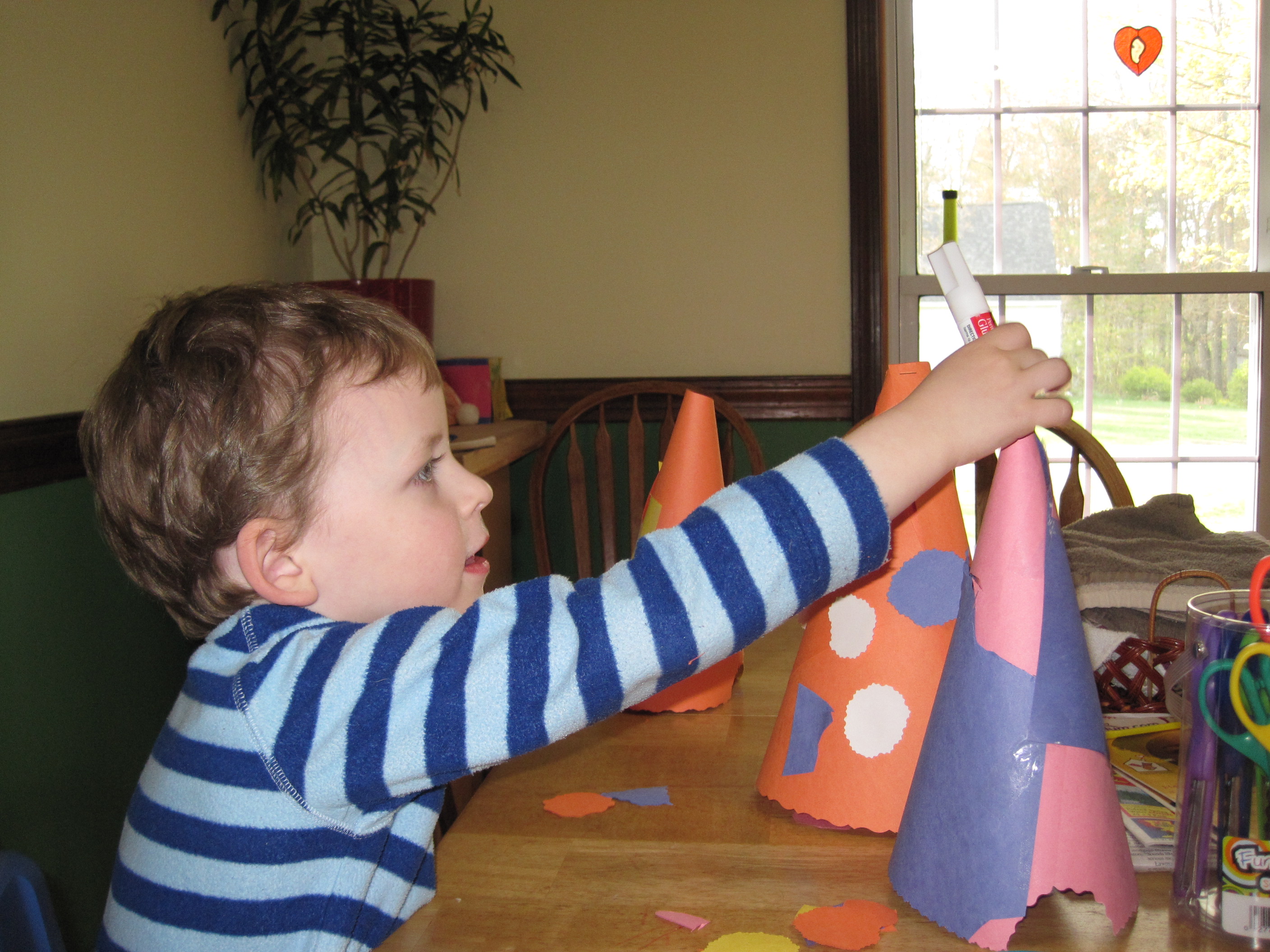 Lex making party hats. He was very specific about how he wanted to make them and went right to work when he woke up.