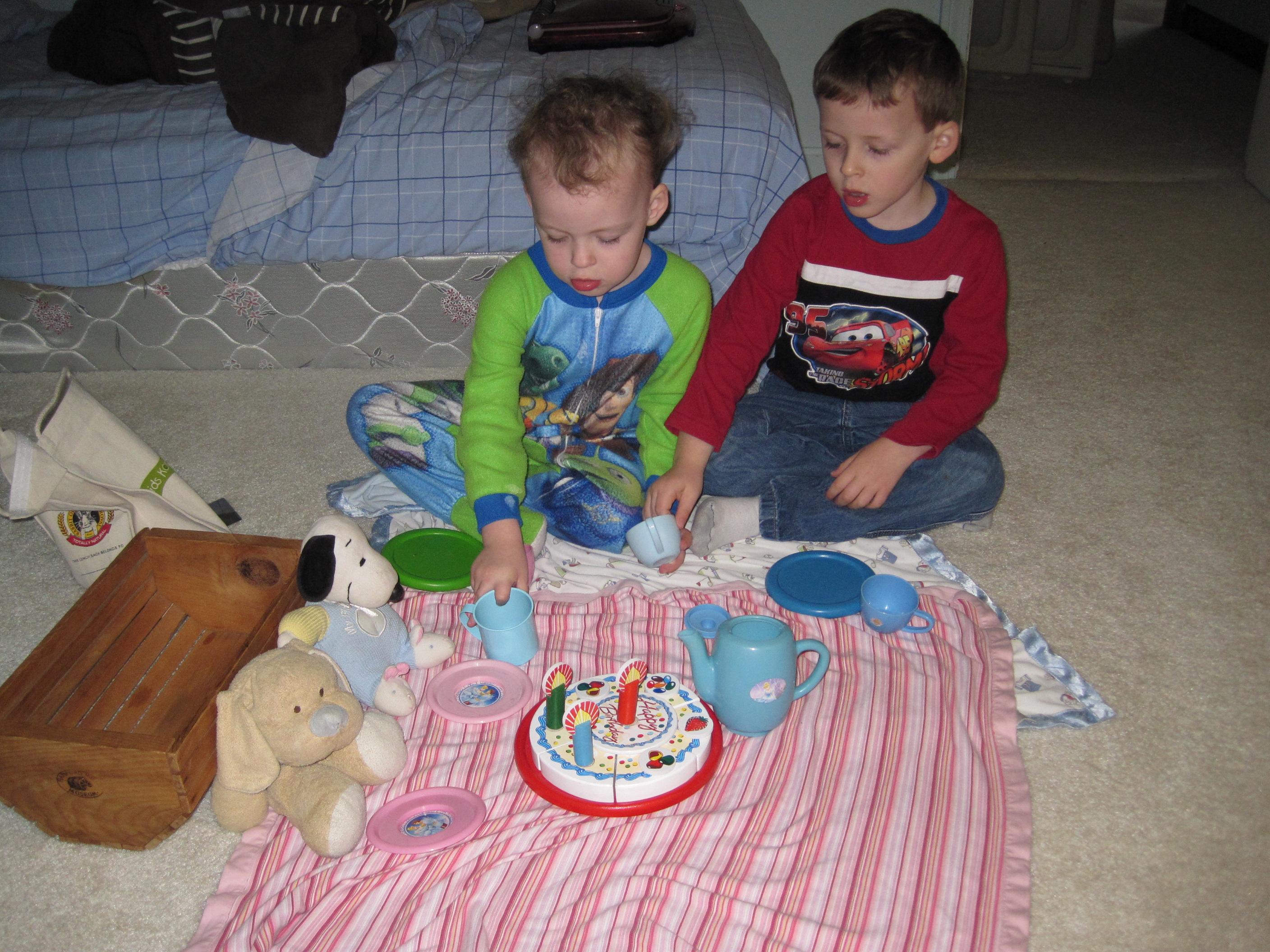 They were so sweet this morning! They had a birthday party for Eve's doggie. They brought all this stuff up, sang to doggie, played music, etc. It was soooo sweet!