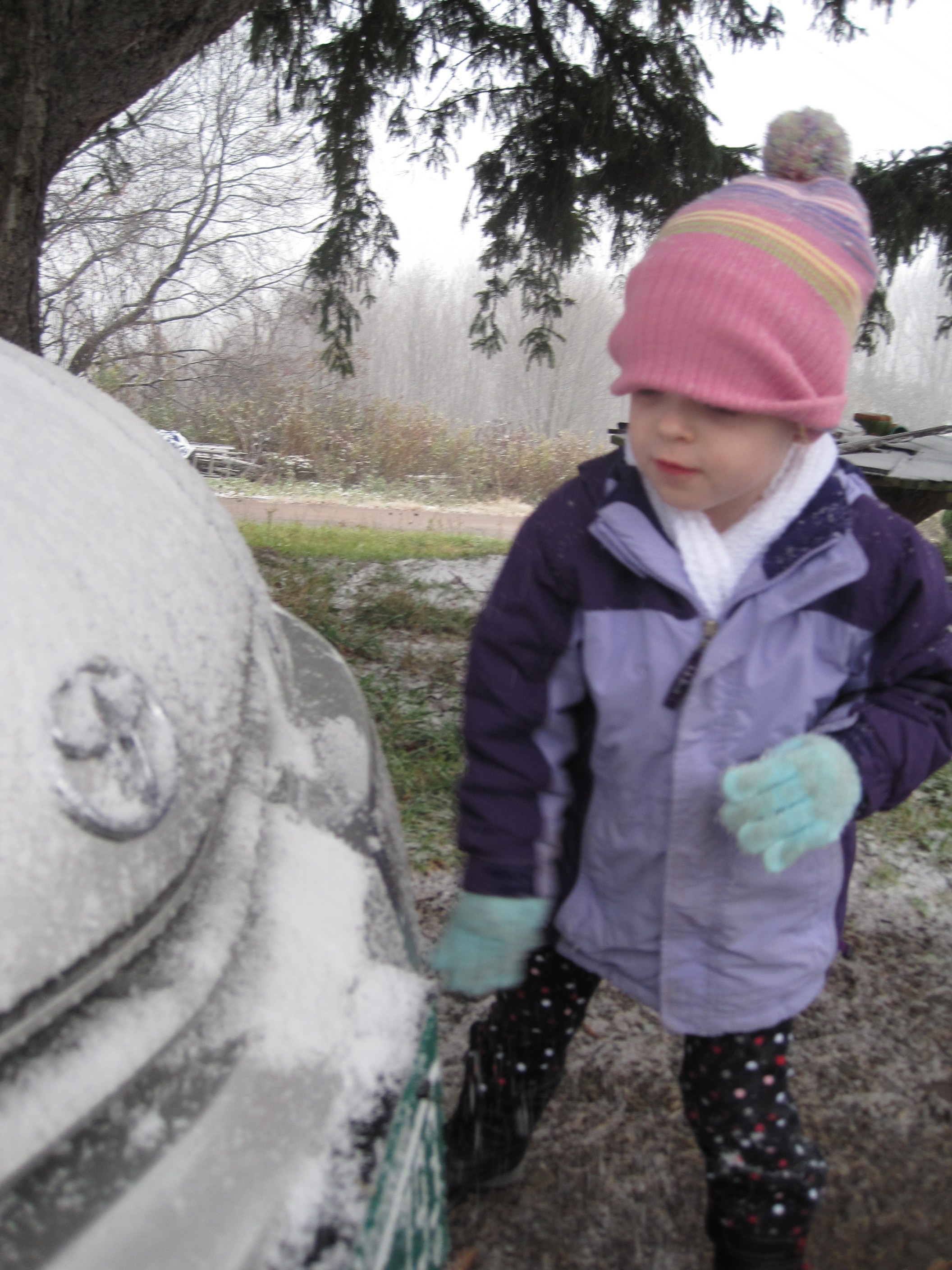 - We saw the first snowfall of the season. Eve was thrilled to wipe off the car. Let’s see how long that enthusiasm lasts!