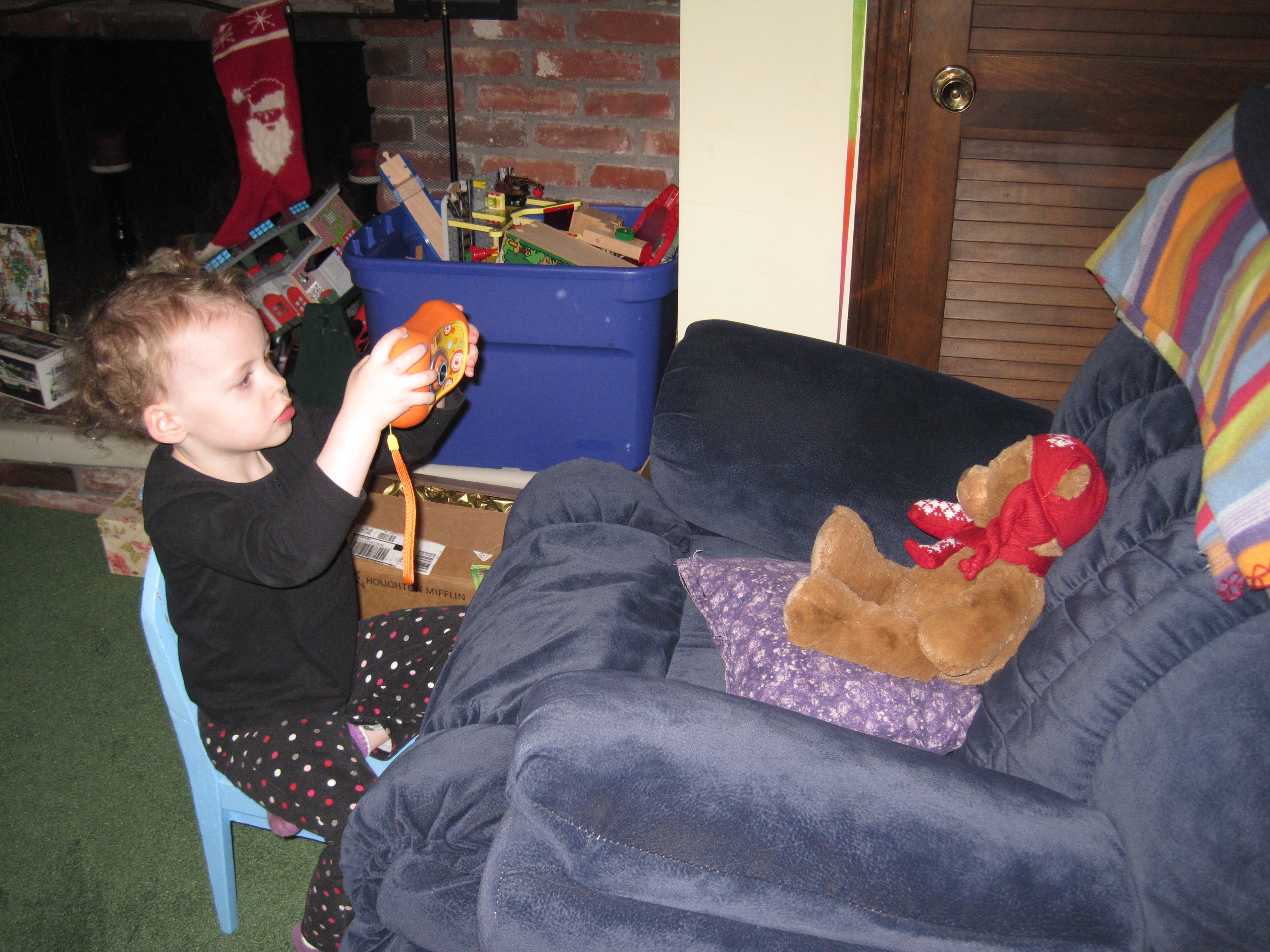 I think Eve really likes the new camera. I often hear her saying, “Ok now, smile. Say cheese!” to random dolls and toys in the living room. I’ll see if I can get the pictures off that camera tonight. Should be interesting :)