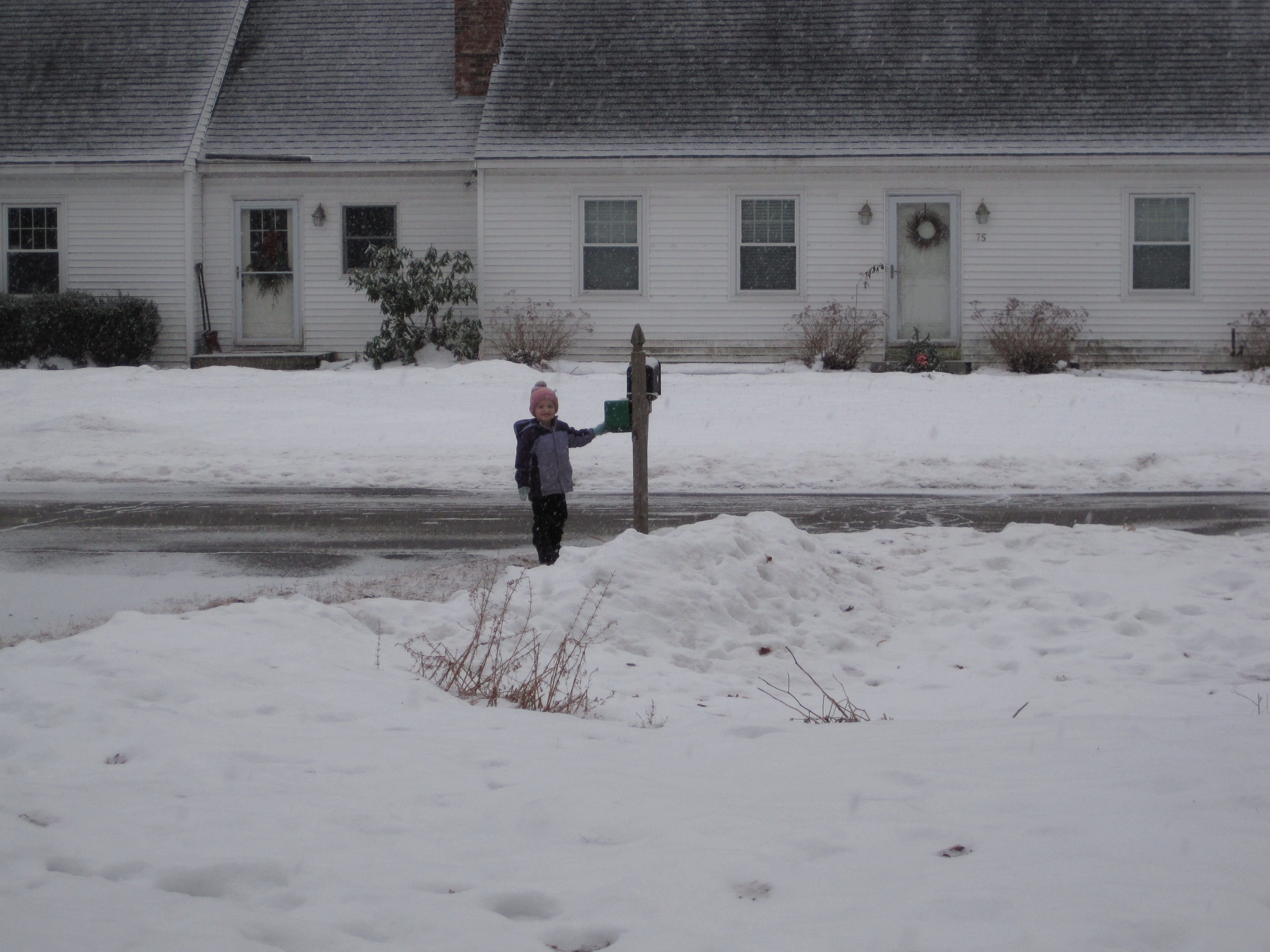 Eve mailing the thank you notes. She likes to bundle up and put things in the mailbox all by herself.