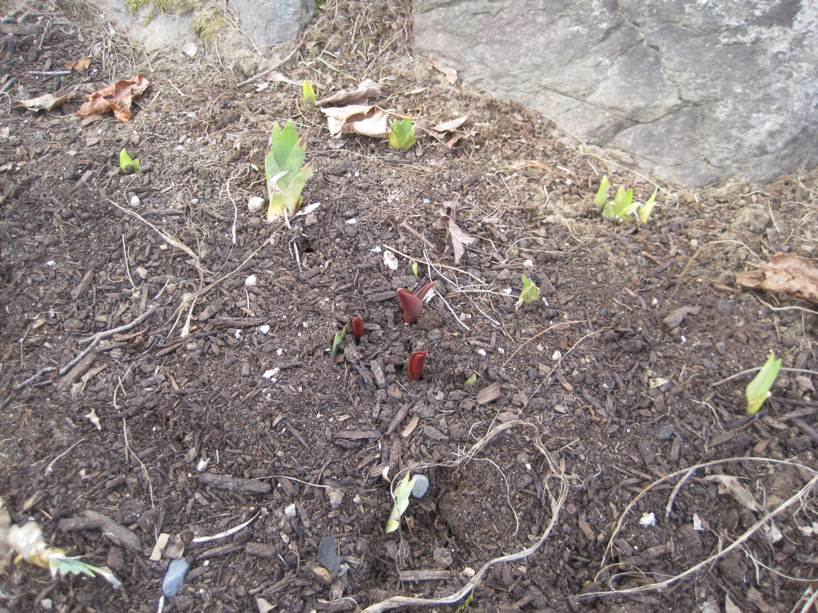 The “red plant” coming up among the irises appears to be a Peony. They look like that in our back yard when they come up. So maybe……