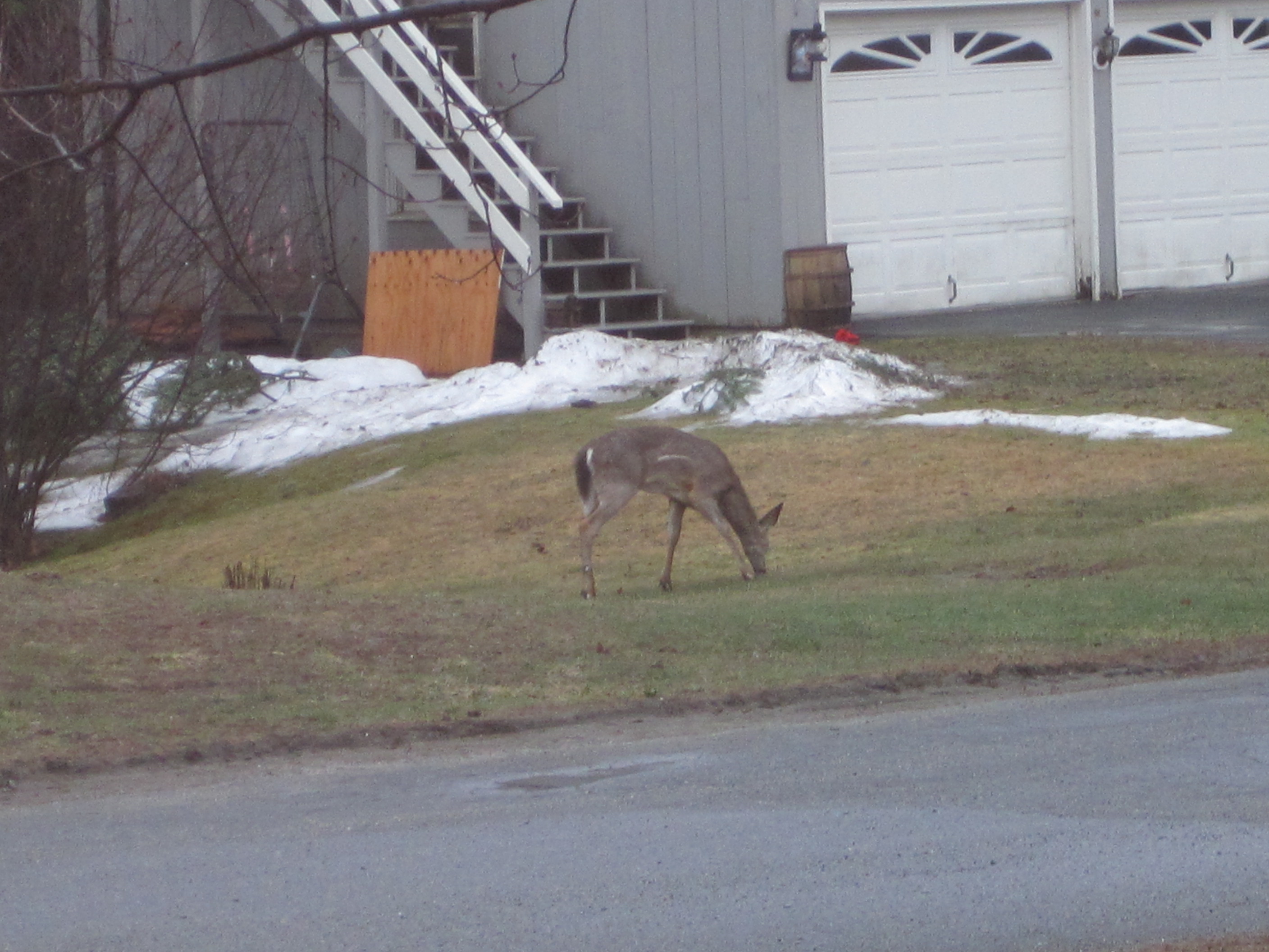 This morning it was dark and stormy, but before the storm came Eve and I were watching birds at the window feeder and suddenly we saw a deer! Did I tell you about the deer from a few weeks ago? Apparently there is a herd of deer (14, says my neighbor) who live in the small woods at the end of the street. A few weeks ago I saw four deer walking downtown, trying to cross Rt 5! I guess they are still around. I don’t think our neighborhood is the best place for deer.