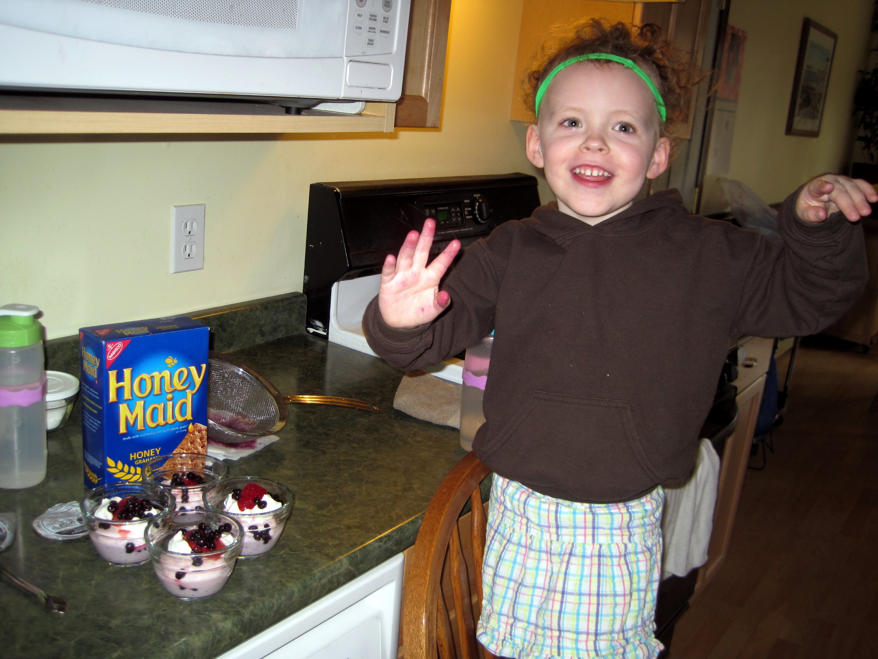 For snack yesterday Eve and I made fruit parfaits, something she made at school a few weeks ago and loved. She told me step by step how to do it and (with a bit of convincing) allowed me to make minor modifications to the recipe. They were a big hit at snack time. Lex even ate two, after a bit of reassuring Eve that it would be ok for Lex to eat daddy’s parfait. He was fine with it :) We’ll have to make them again soon!