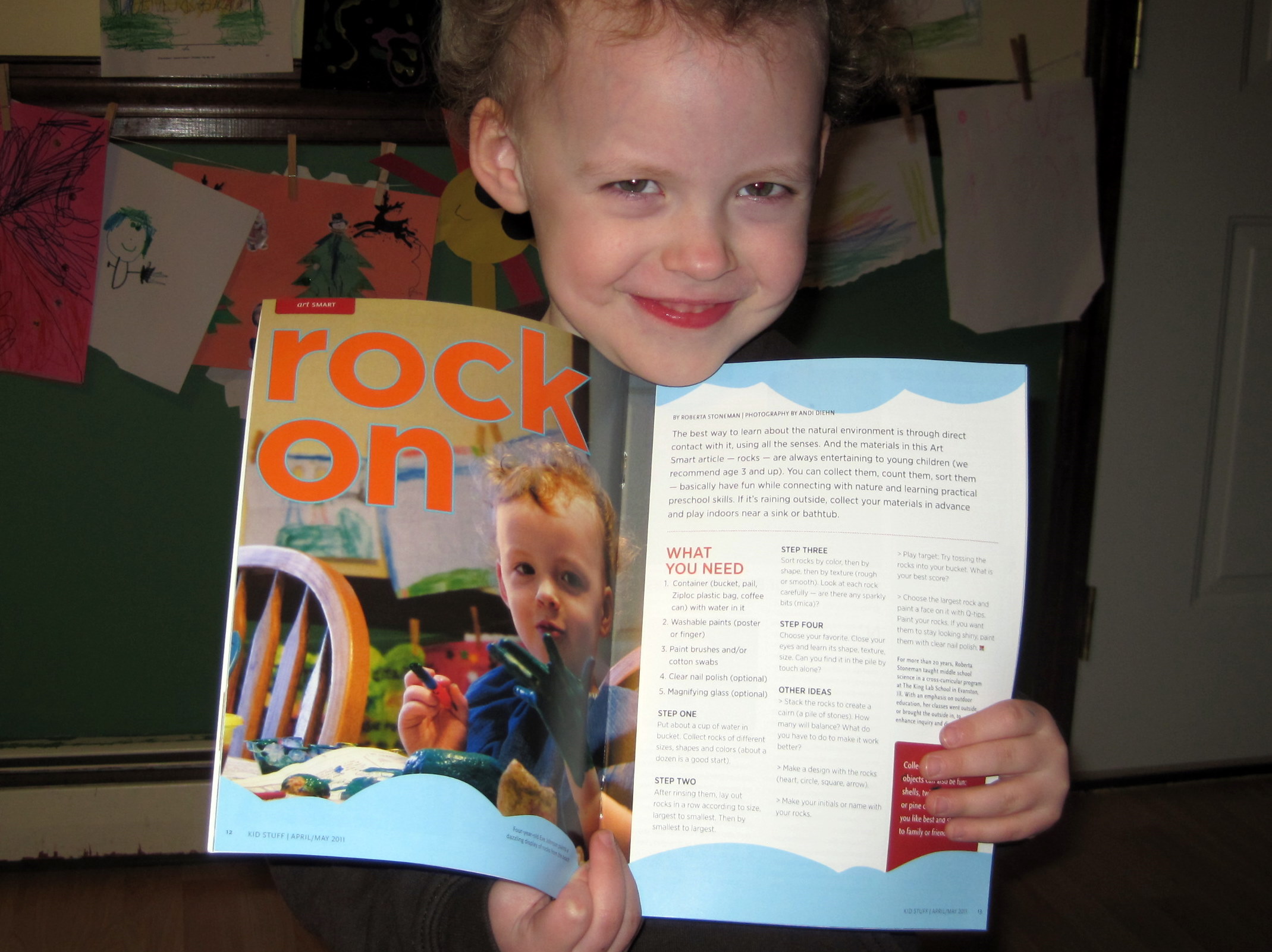 The grandmother of one of Eve’s classmates came to school yesterday and was super excited about it. I hadn’t seen the magazine yet and didn’t know she would be in this issue. The grandmother was raving. Last night I got a copy from my friend (the photographer!) and, of course, she is adorable. This morning the grandmother brought her copy to school and showed all of the parents and kids and Eve’s teachers. Everyone was making a big deal over her today. It was funny. Eve was so nonchalant. She just said, “yep, I was painting rocks.” :)
