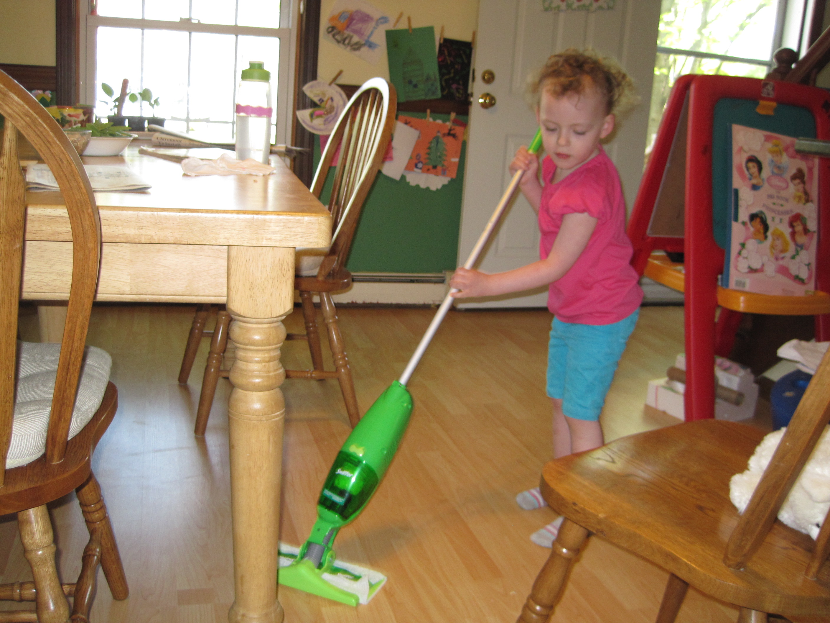 I broke down and bought a Swiffer Sweeper Vac. So many people say it’s wonderful but I have resisted spending money when I can just use a broom. A good old fashioned broom. But my kids drive me crazy with their crumbs and I just don’t sweep enough, so I thought I’d give this a try. It works well, and my unexpected surprise is that the kids love it too! Eve vacuumed the floor after snack and after dinner today. We started talking about chores again (more on that soon!) and she asked if this could be one of her chores. A-OK!