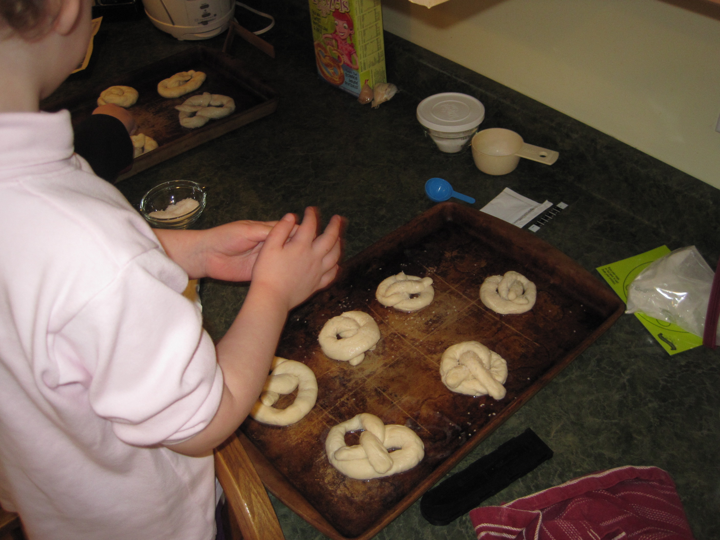 We made pretzels this morning, from a kit Lex received as a birthday gift! It was a baking kit / science experiment all at once. You had to proof the yeast and measure the water temperature and the instructions included all sorts of interesting facts about yeast and bread and pretzels and salt. It took us all morning, due to the numerous breaks required for the dough rising. It was fun though and the whole family got involved. Best of all, the pretzels were delicious!