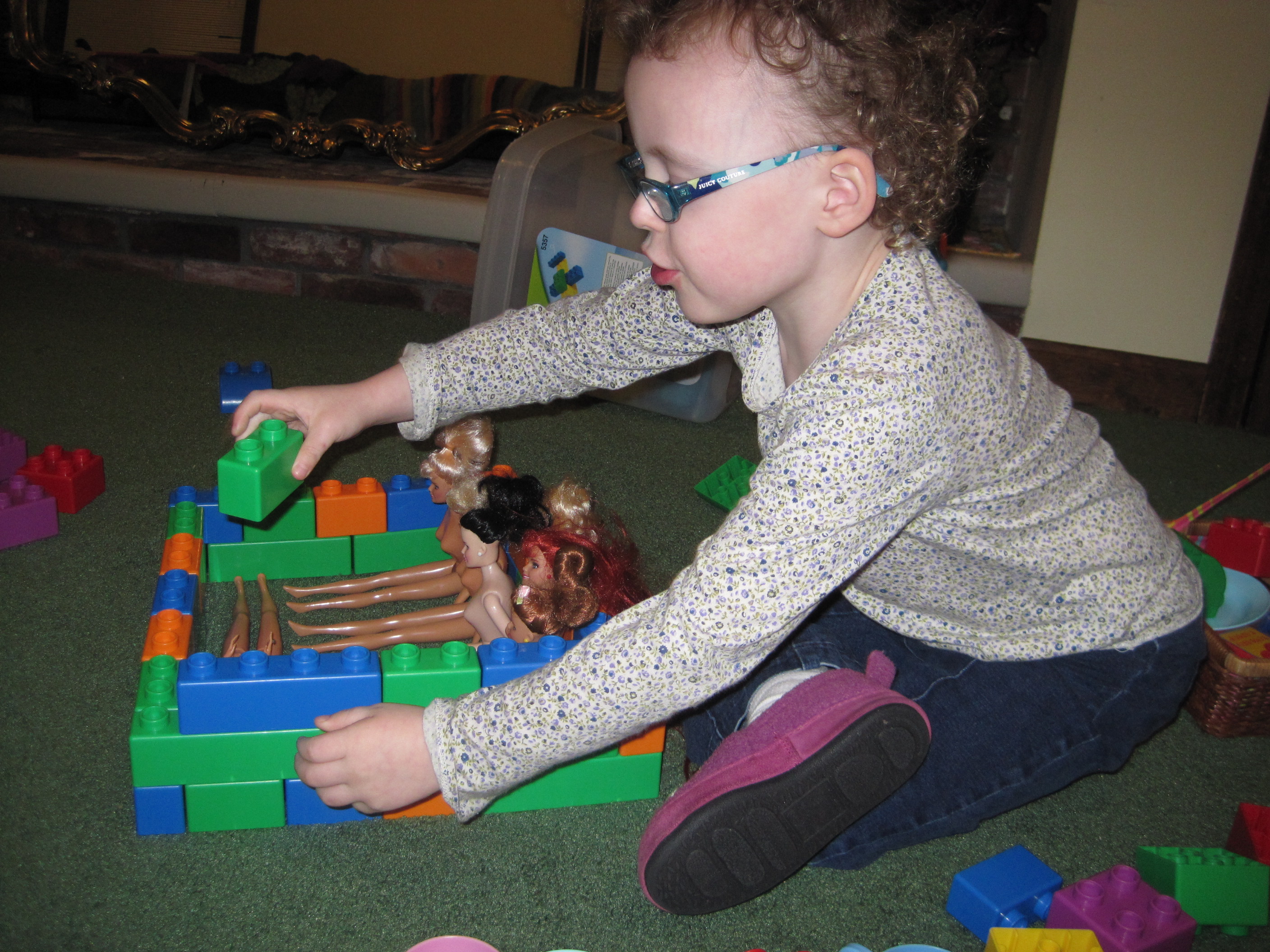 We have lots of naked barbies around these days. The kids love playing with them but see no real use for their clothes. Eve says, "I just pretend they are in their clothes." I think the clothes are still a little too difficult for their young fingers to manage.