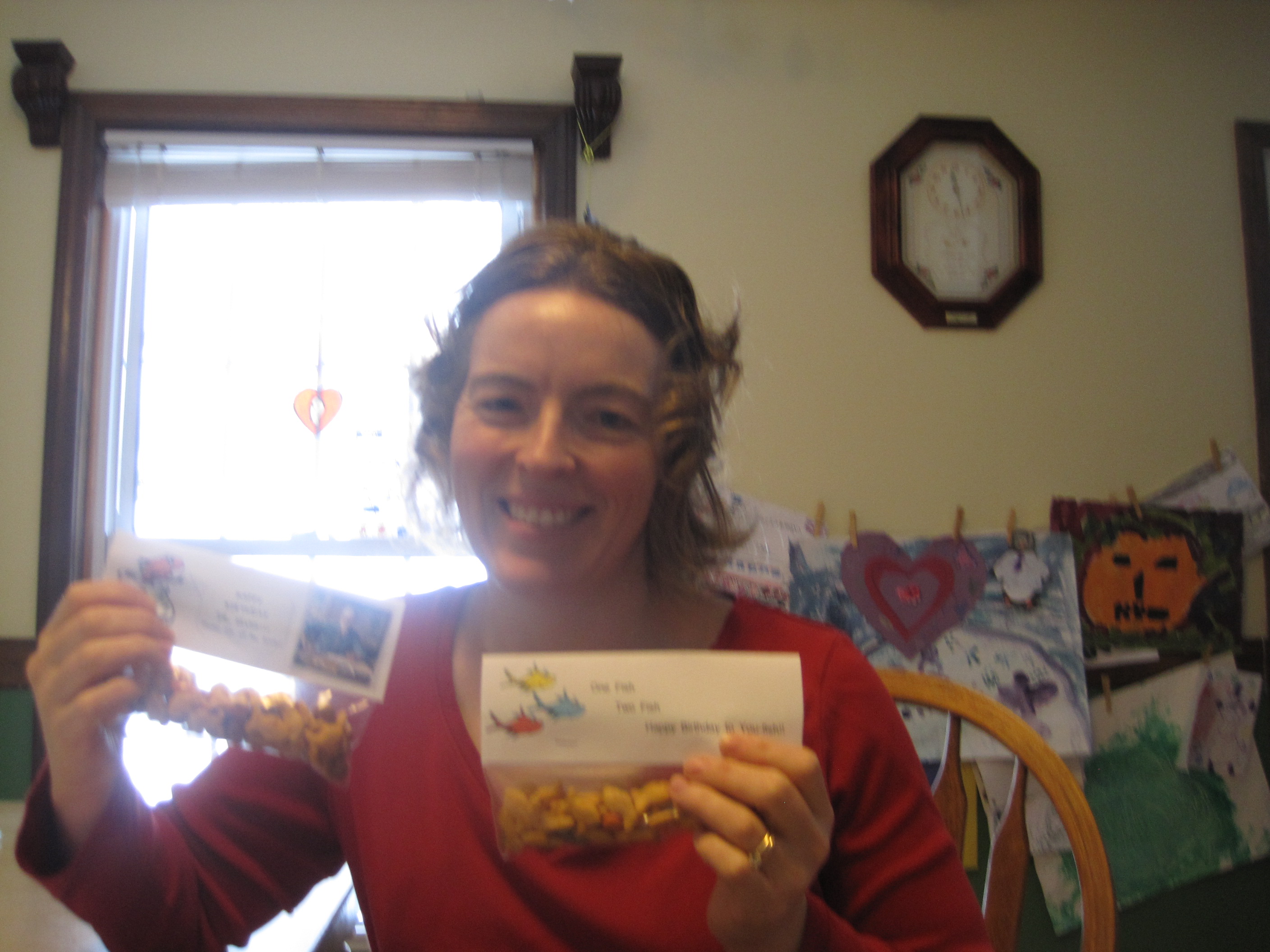 To celebrate this day we decided to make treats to bring to school. We thought long and hard about treats that could be made quickly (I just realized it was his birthday about two days ago!) and treats that were portable and could be brought to school unannounced :) I didn’t want to show up with a giant Cat in the Hat cake and have their teachers hate me forever! We decided on Goldfish in baggies. I wanted to mix in some chocolate graham goldfish, or maybe swedish fish or something, but our local Co-op had limited options so we stuck to plain, rainbow, and pretzel fish. Then we made tags and stapled them on top.