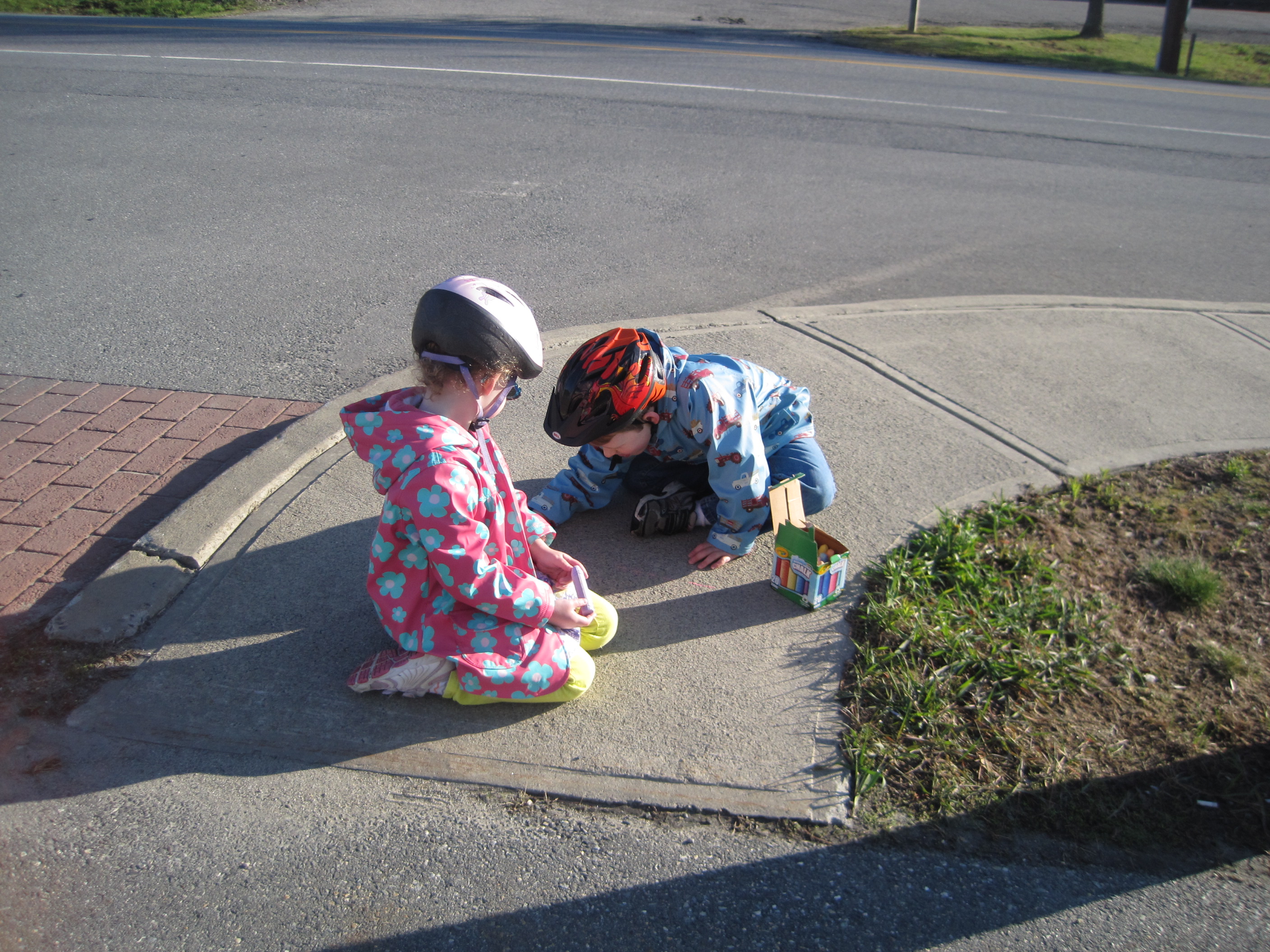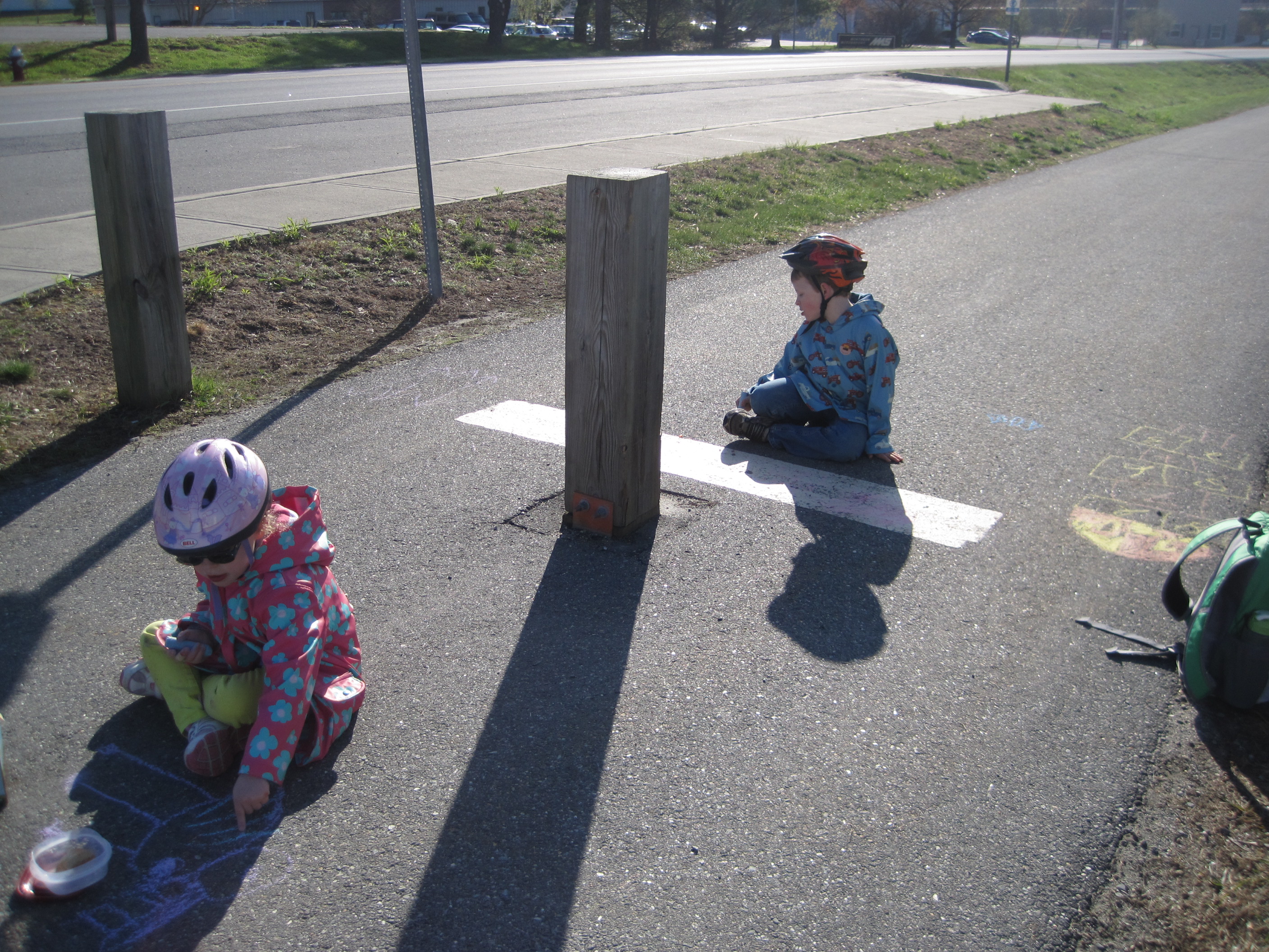 I brought sidewalk chalk along so the kids wouldn't get bored while I worked. Work = watching kids on the path, making sure no one gets hurt, helping them cross a little side street.