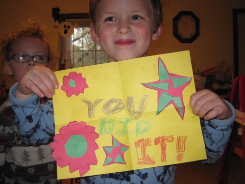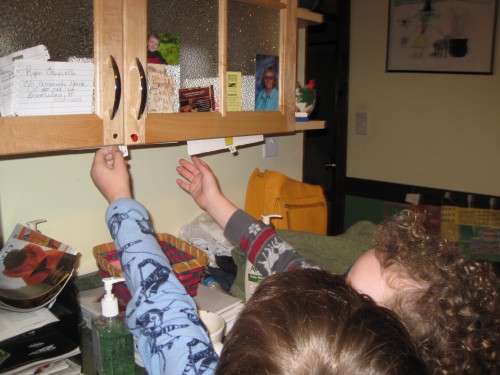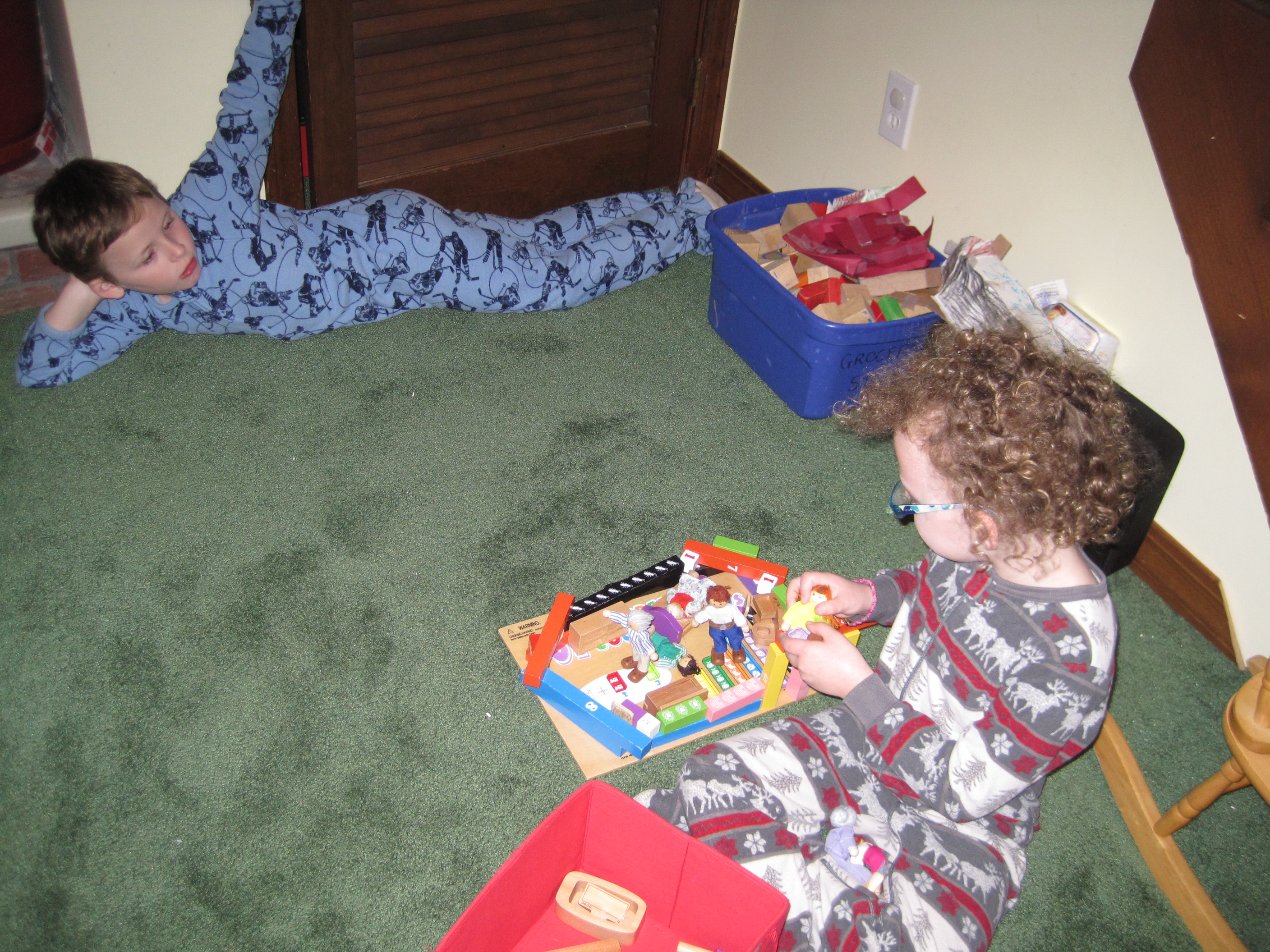 The kids spent the better part of the day putting together treasure hunts. Lex started his and Eve wanted to help, but he wouldn’t tell her what the treasure was at the end, so she decided to make her own treasure hunt instead. He was sweet and helped her with her spelling and writing. After quiet time and snack they were done and we did the hunts. We started with Eve’s.