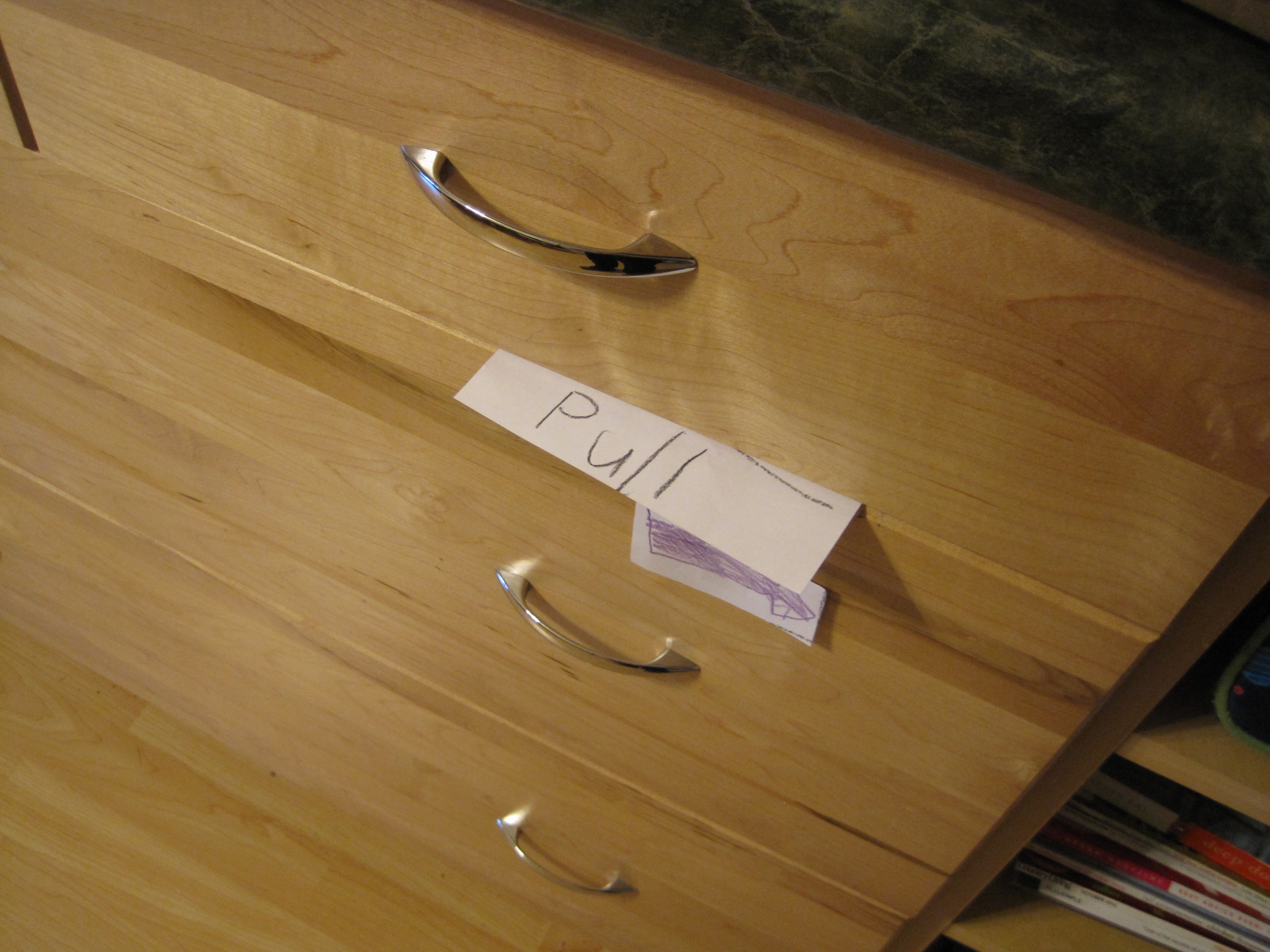 “There is an arrow pointing to the next clue.” The “pull” was sticking out of the cabinet so that was the only part of the clue that was visible.