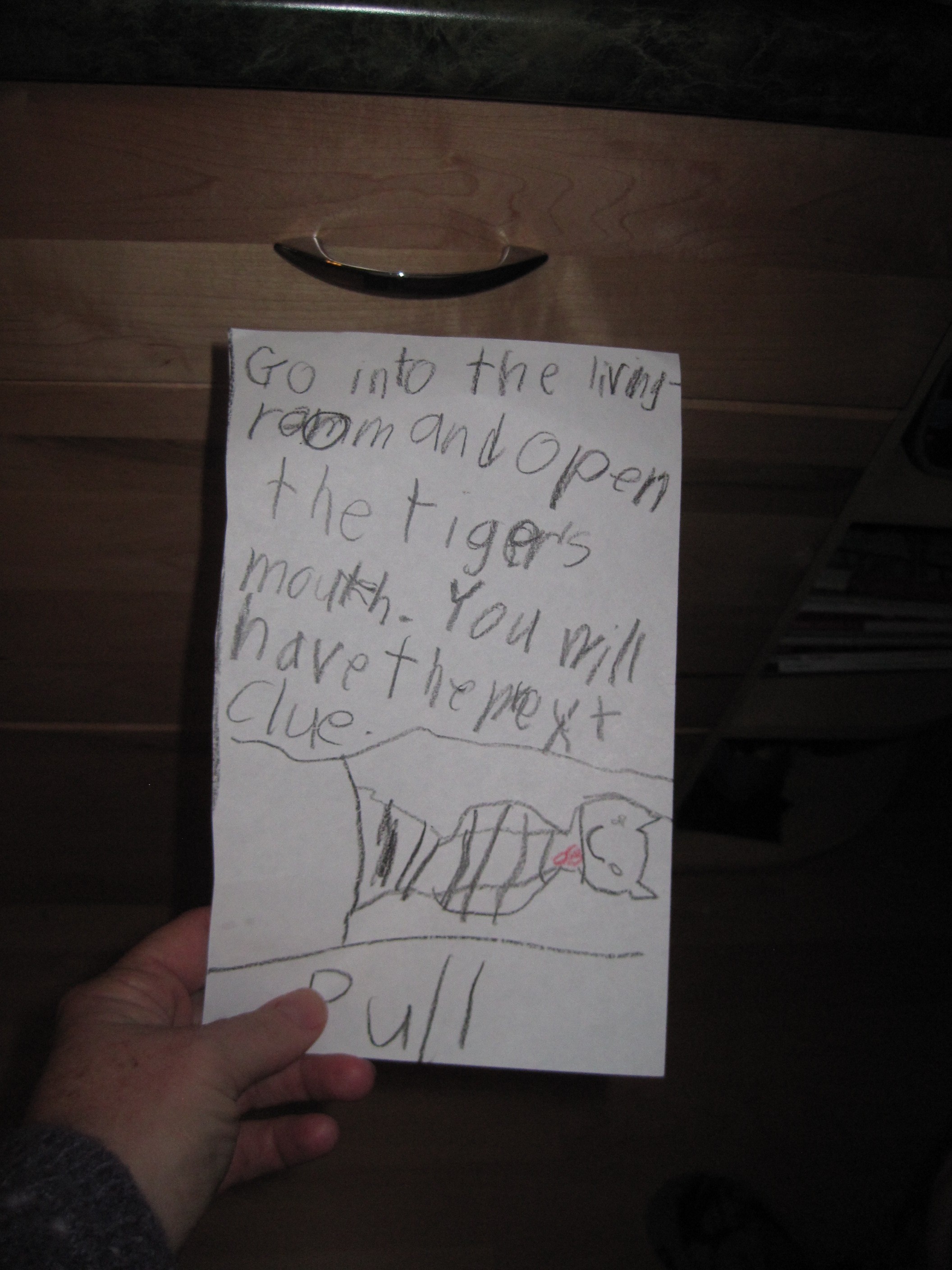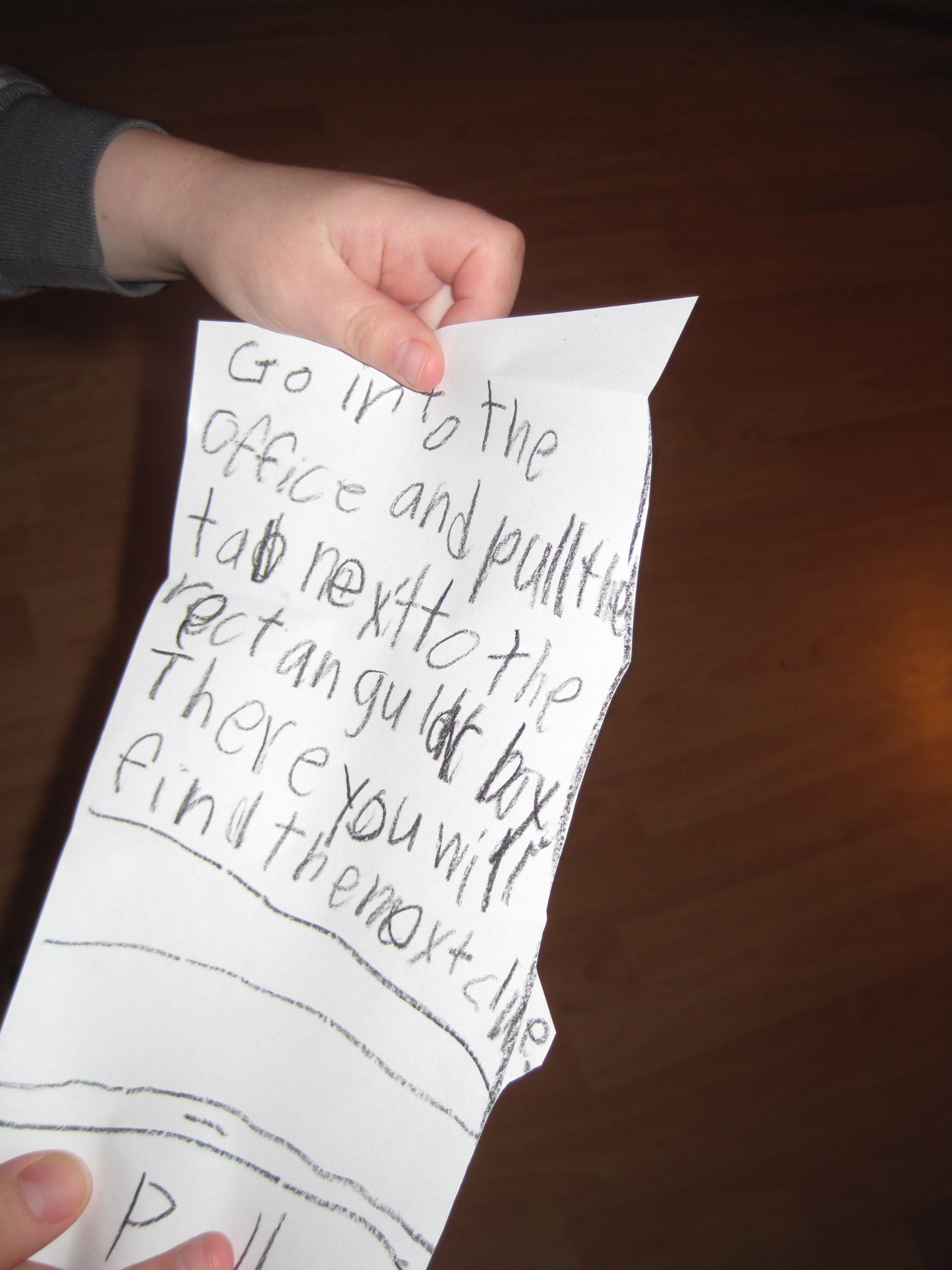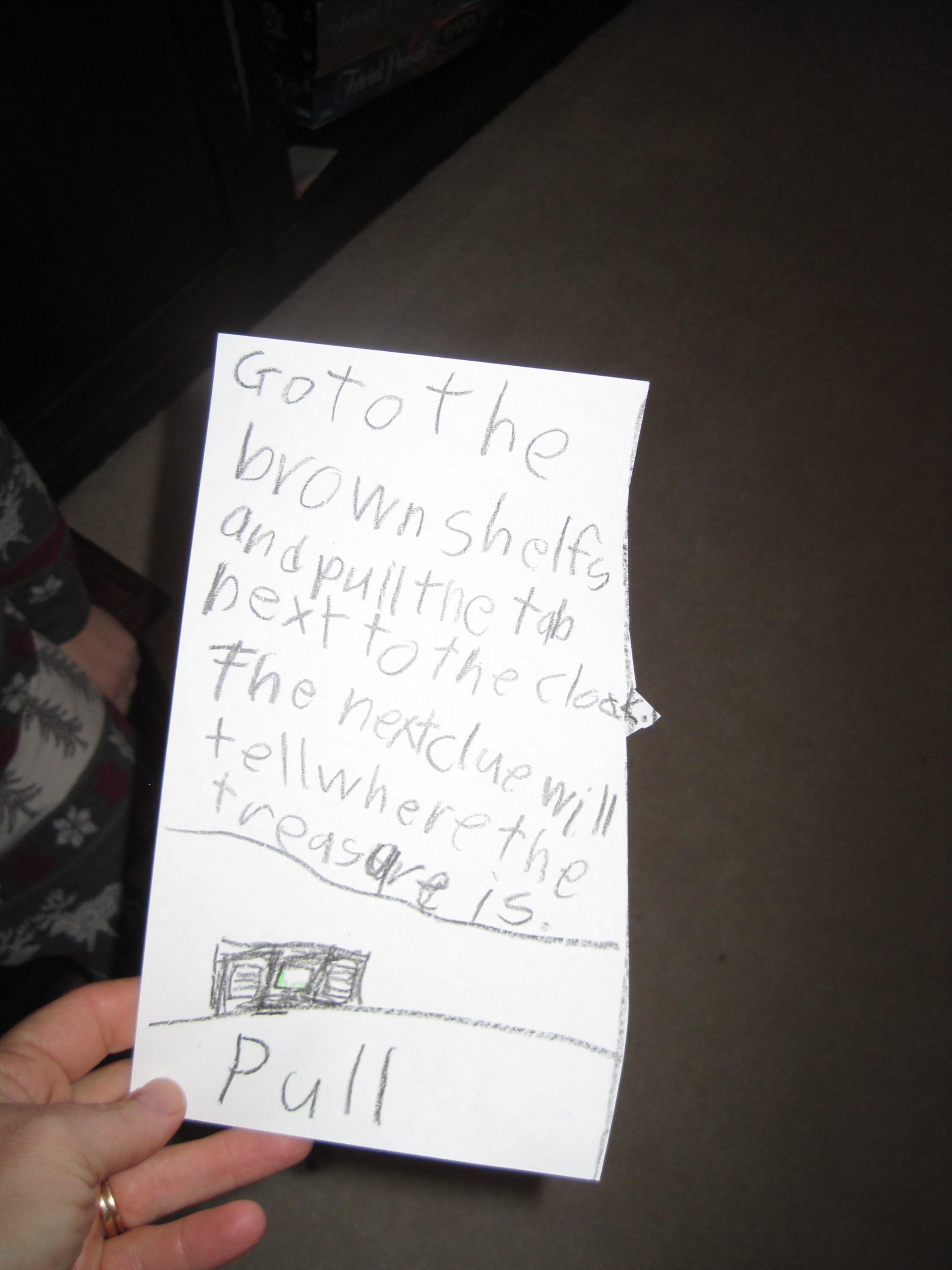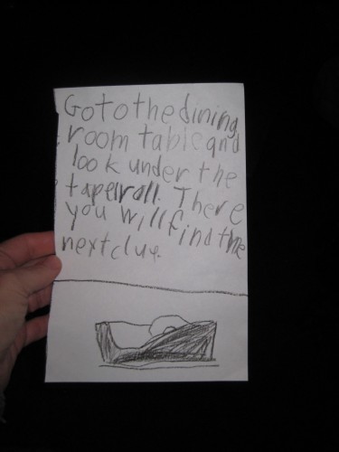 Then we moved on to Lex’s treasure hunt. I love their writing so I took pictures of all the clues. They are just so sweet! His writing is more legible so I’m not going to transcribe them all.