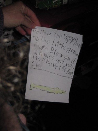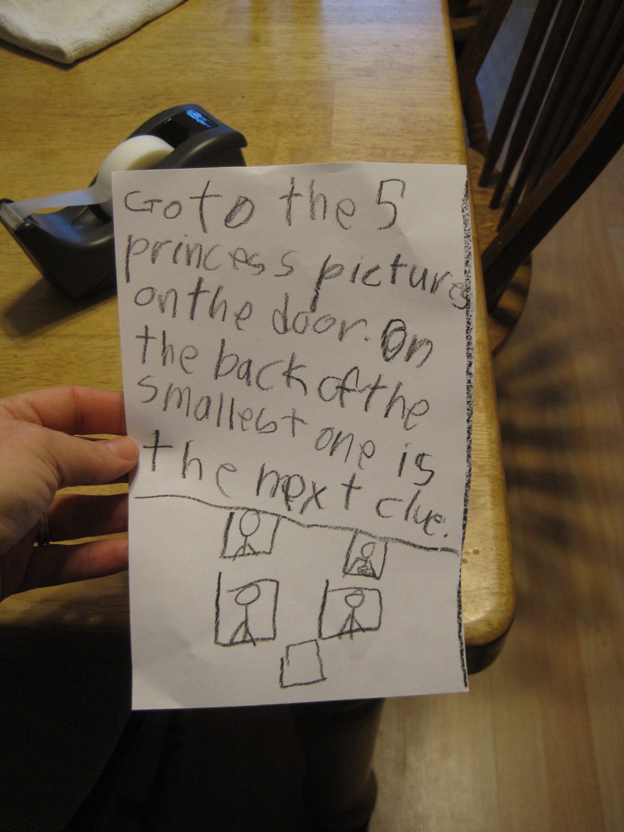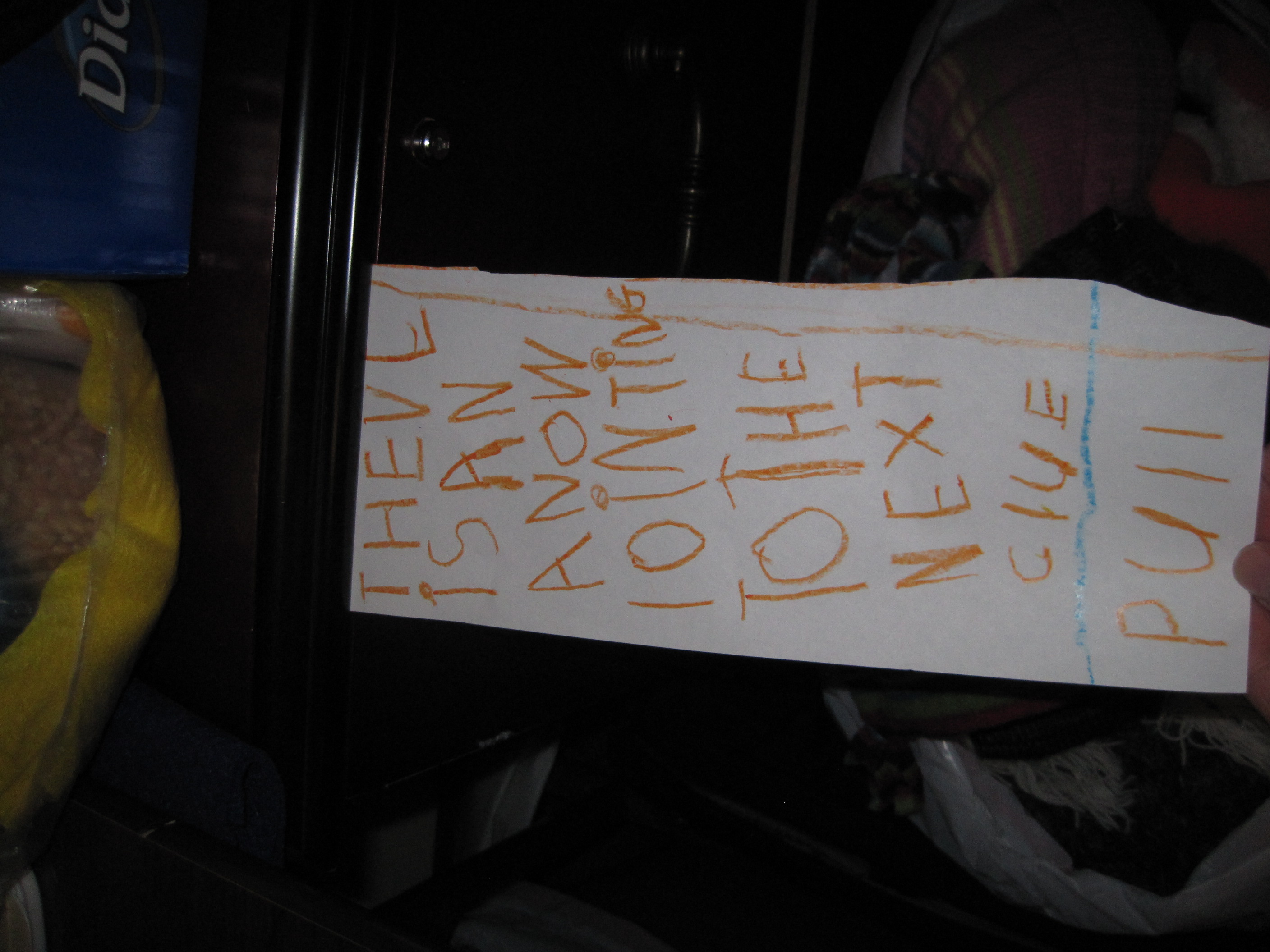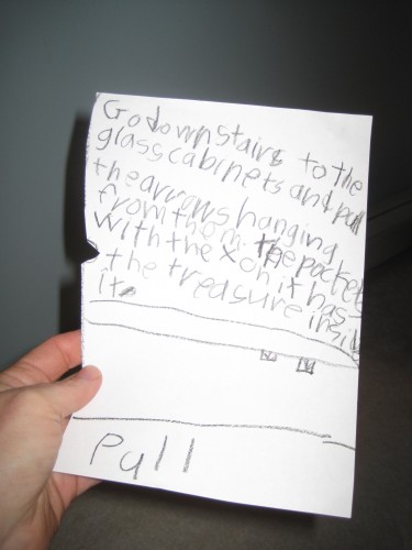 Then we moved on to Lex’s treasure hunt. I love their writing so I took pictures of all the clues. They are just so sweet! His writing is more legible so I’m not going to transcribe them all.