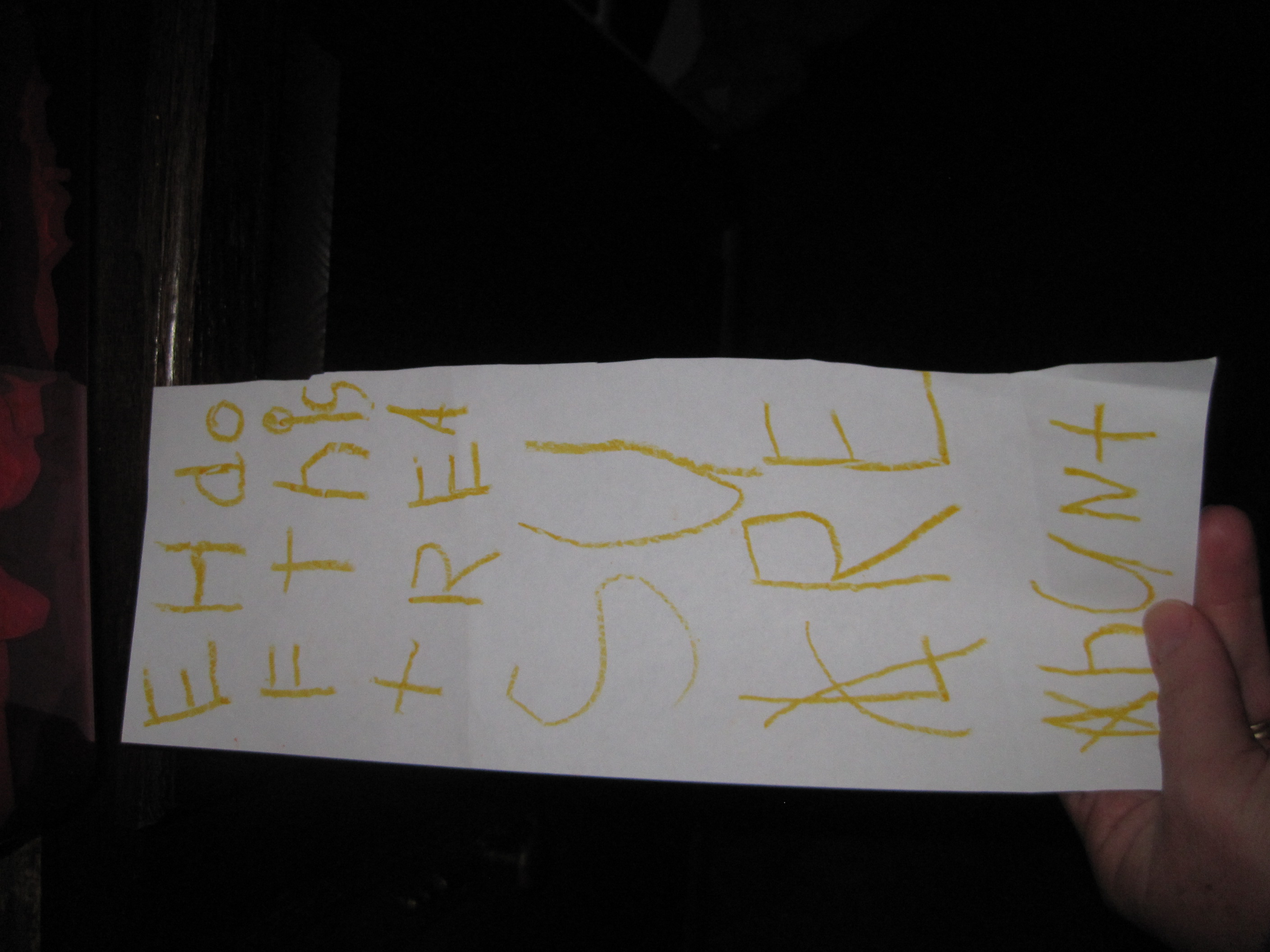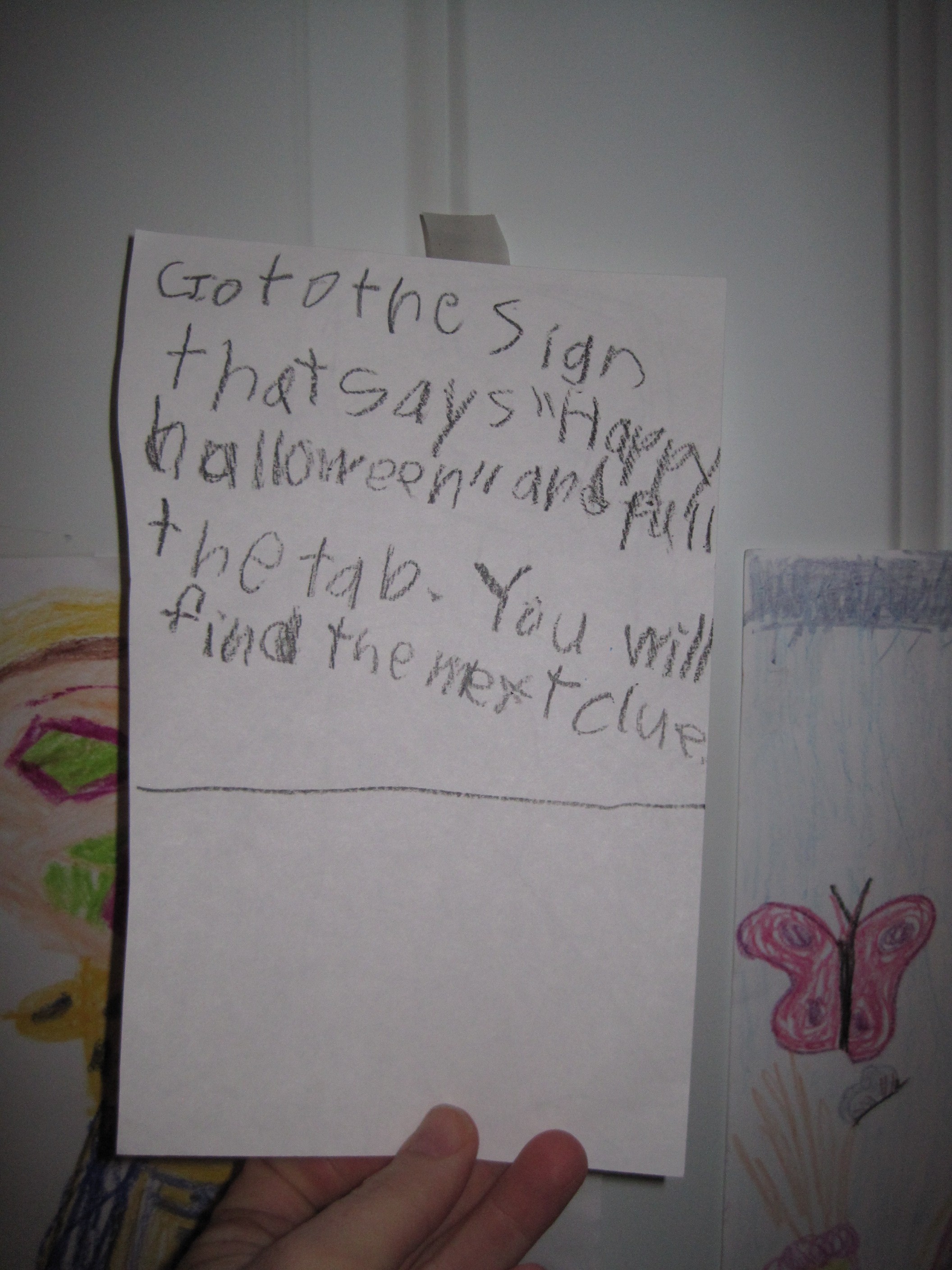 “end of this treasure hunt.” The way Lex helped was by writing out the sentence she wanted to say on a scrap paper and then she transcribed onto her clues. I can see areas where his messy handwriting resulted in poor spelling on her clues. :)