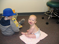 So the nurse brought us to the actual examining room where I got Eve settled and relaxed again. I even offered her a sweet bribe (lunch at Panera) for cooperation with the doctor. She colored and read books happily until the doctor came in and then buried her face right back into my neck. I sat in the chair, did my best to get her situated on my lap, the doctor was super nice and promised to let her watch some Nemo at the end. Nothing. At one point I even had Eve sitting properly (me holding down her hands) and head up (my hand on her forehead, keeping it up) but she squeezed her eyes shut tight and wouldn’t open them. Not much we can do from there. Sigh.