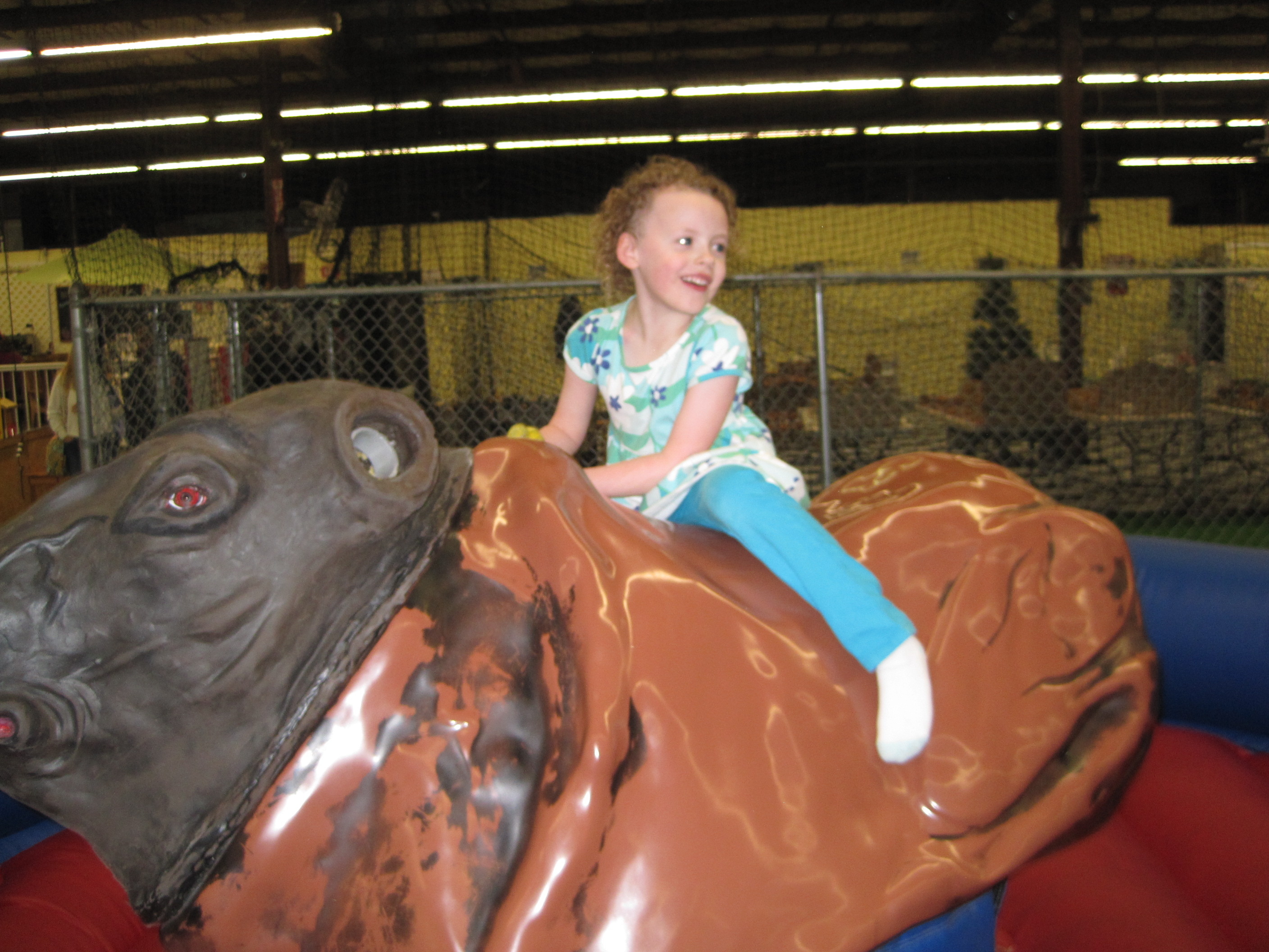 They have a mechanical bull that the kids all love. I think it’s a little weird looking, especially here with no horns (the kids kept pulling them off). Eve enjoyed her turn.